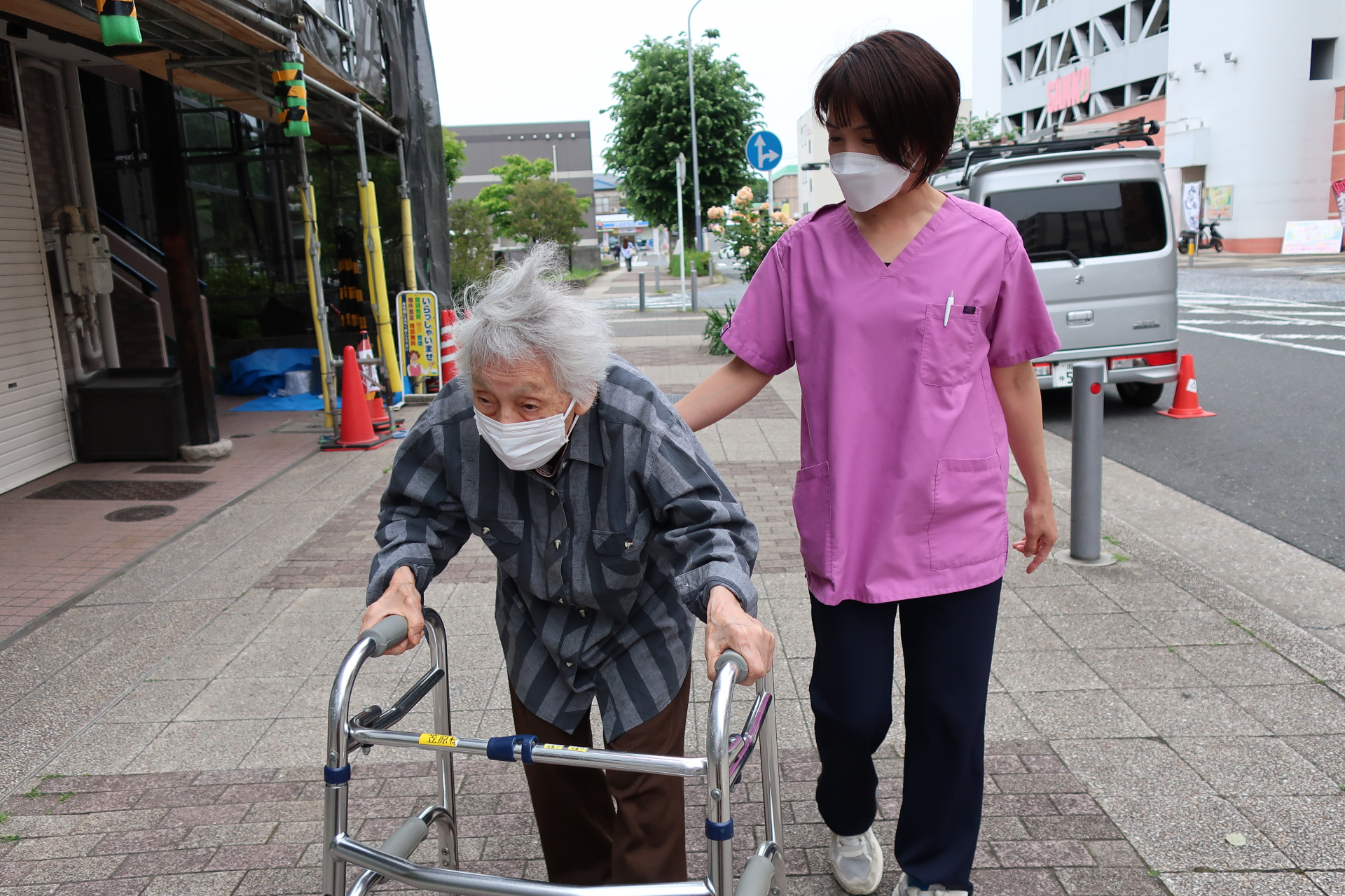 室内での訓練ももちろん頑張ってくださいますが、実際に外に行って300mほどを歩くのも気分転換になるものです。