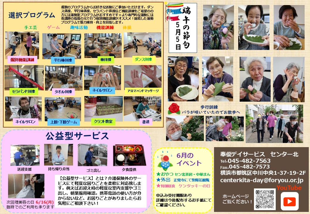 2025.06.05 活動報告 【センター北デイ】令和7年 デイ新聞5月号 Tweet シェアする デイ新聞☆最新号 奉優デイサービスセンター北 前の記事 2025.06.06 活動報告 【センター北デイ】平行棒体操&お散歩から学ぶ転倒予防 次の記事 2025.06.04 活動報告 【センター北デイ】ハラハラドキドキ♪『紙コップタワー』 一覧へ戻る