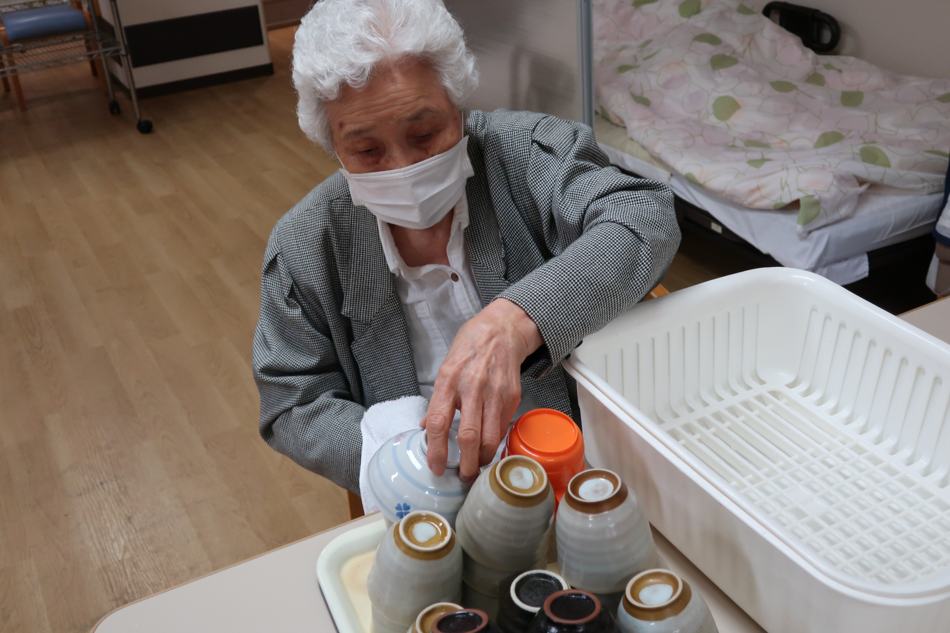 今でもデイに来られた時でさえも、何かをしていないと落ち着かないと仰られて、ご利用者の皆さんが使われた食器やコップ、湯呑み茶碗等をスタッフが洗った後に、拭いて、次に使い易い様にセットして下さいます。