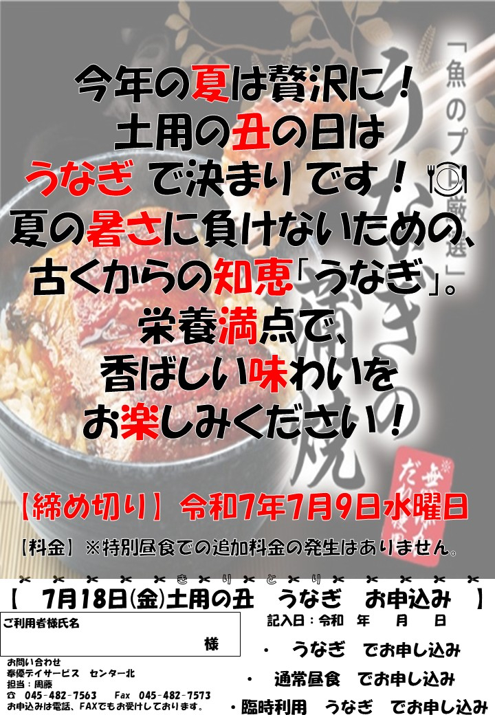 7月18日金曜日にセンター北デイサービスでは、【うなぎ】をご提供!