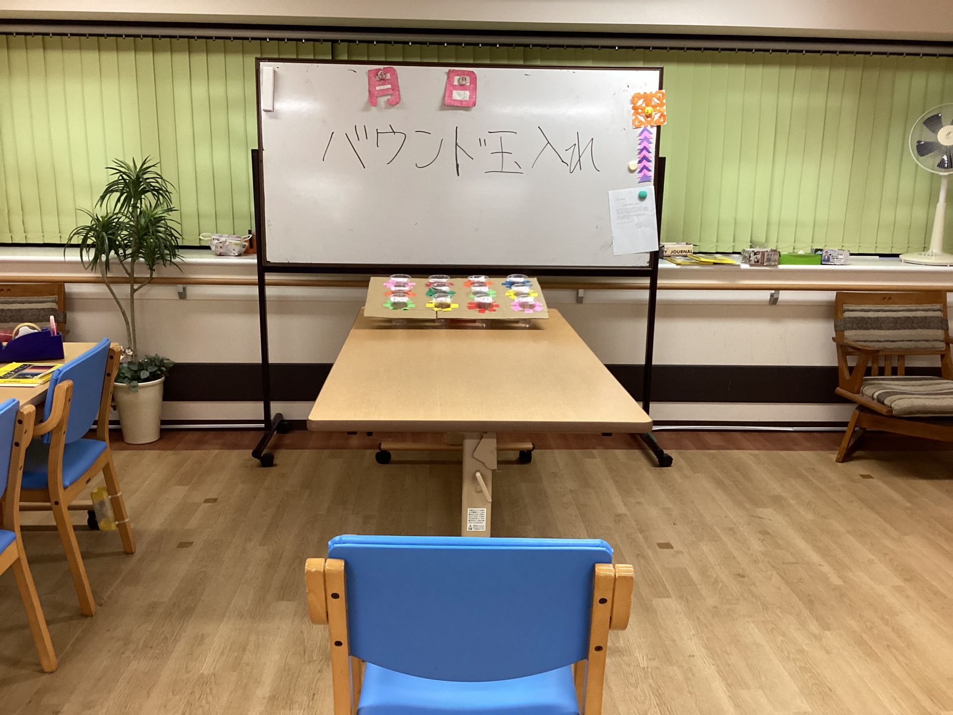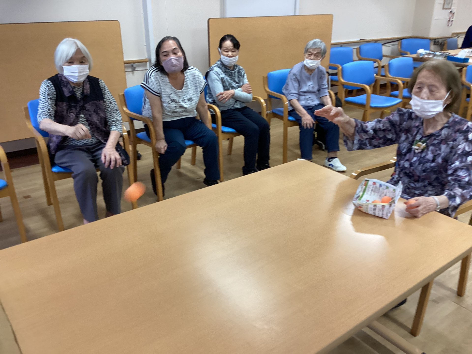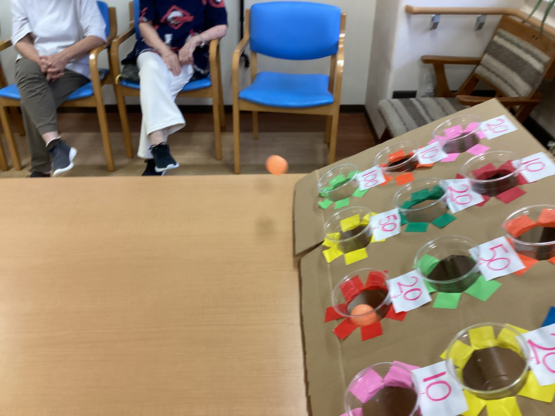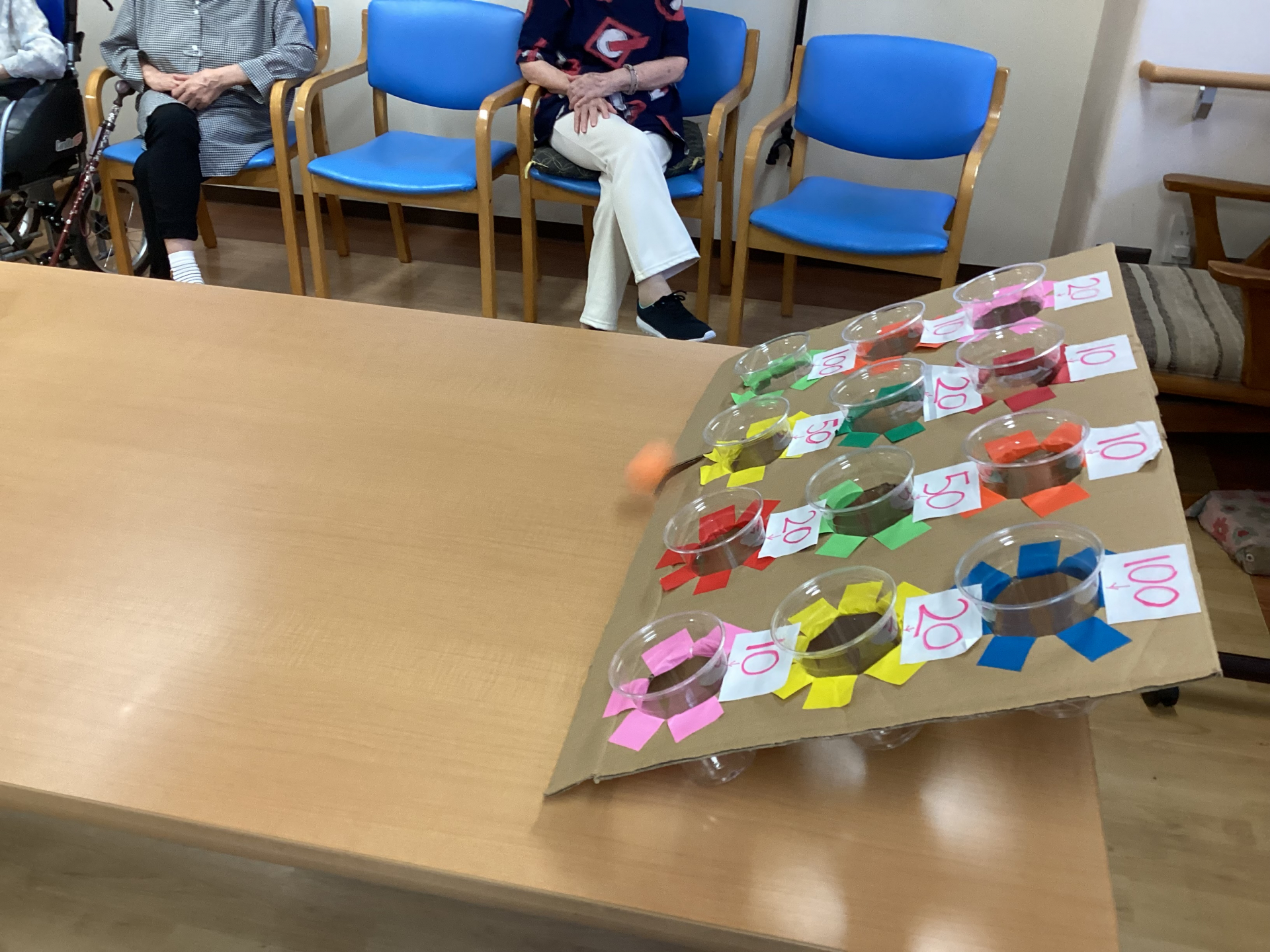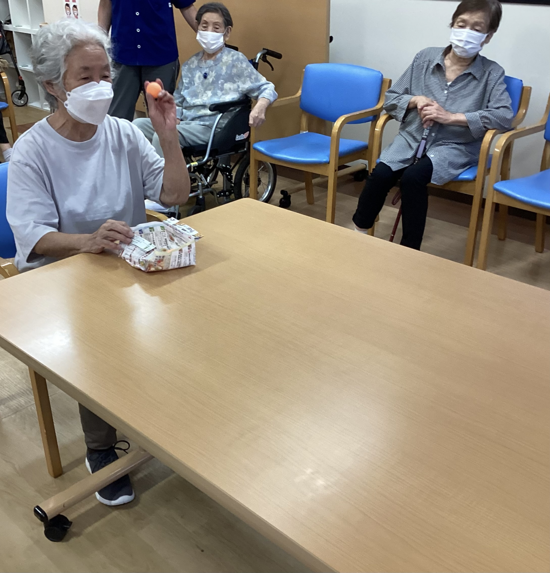 本日、セン北デイでは午後のレクとして、バウンド玉入れというゲームを実施致しました。レクの様子をご紹介致します。