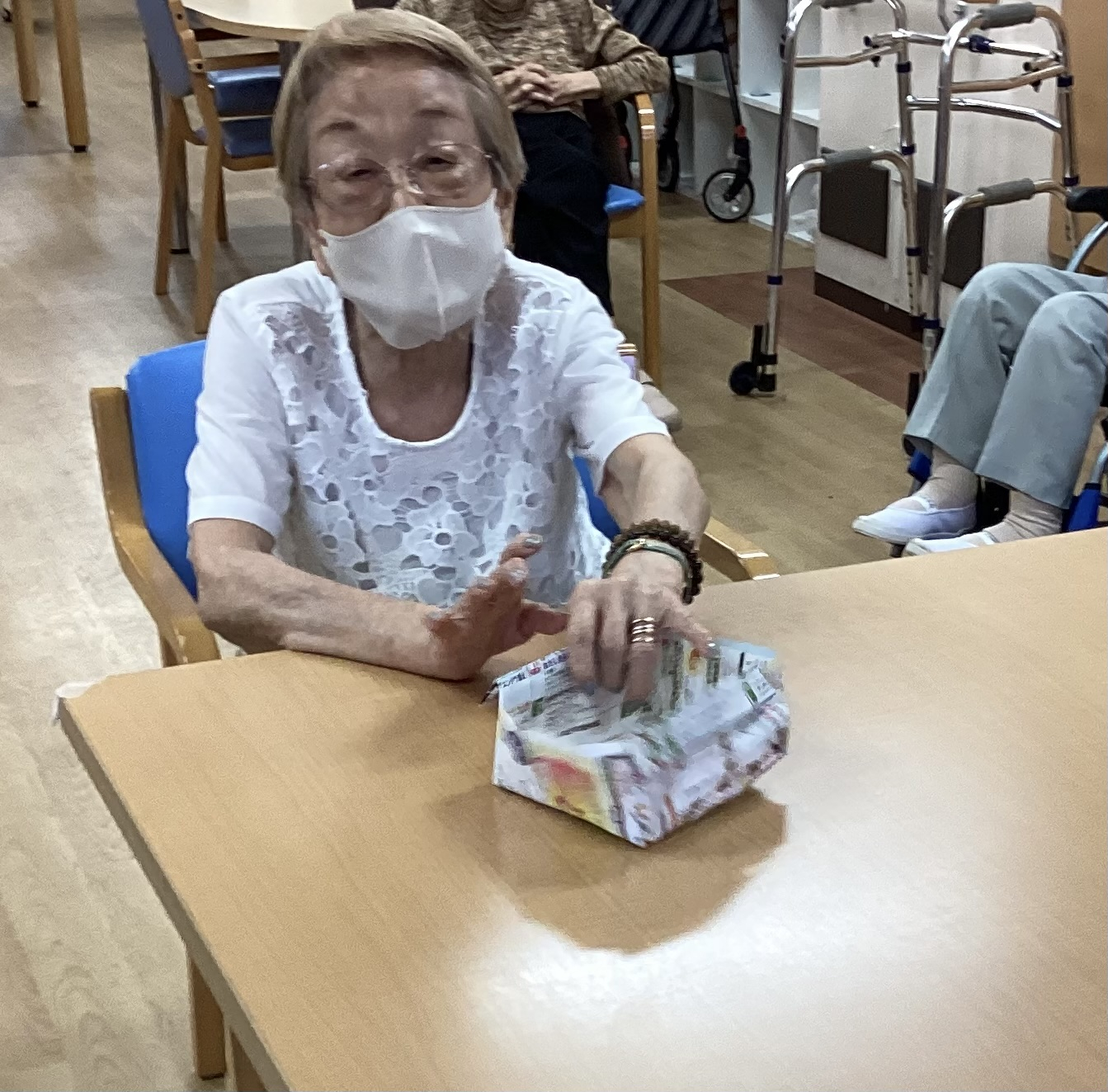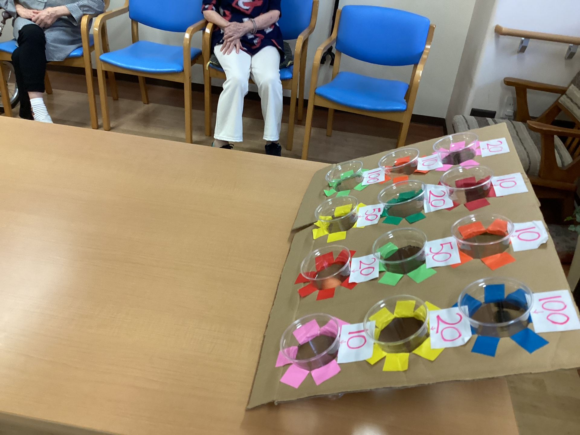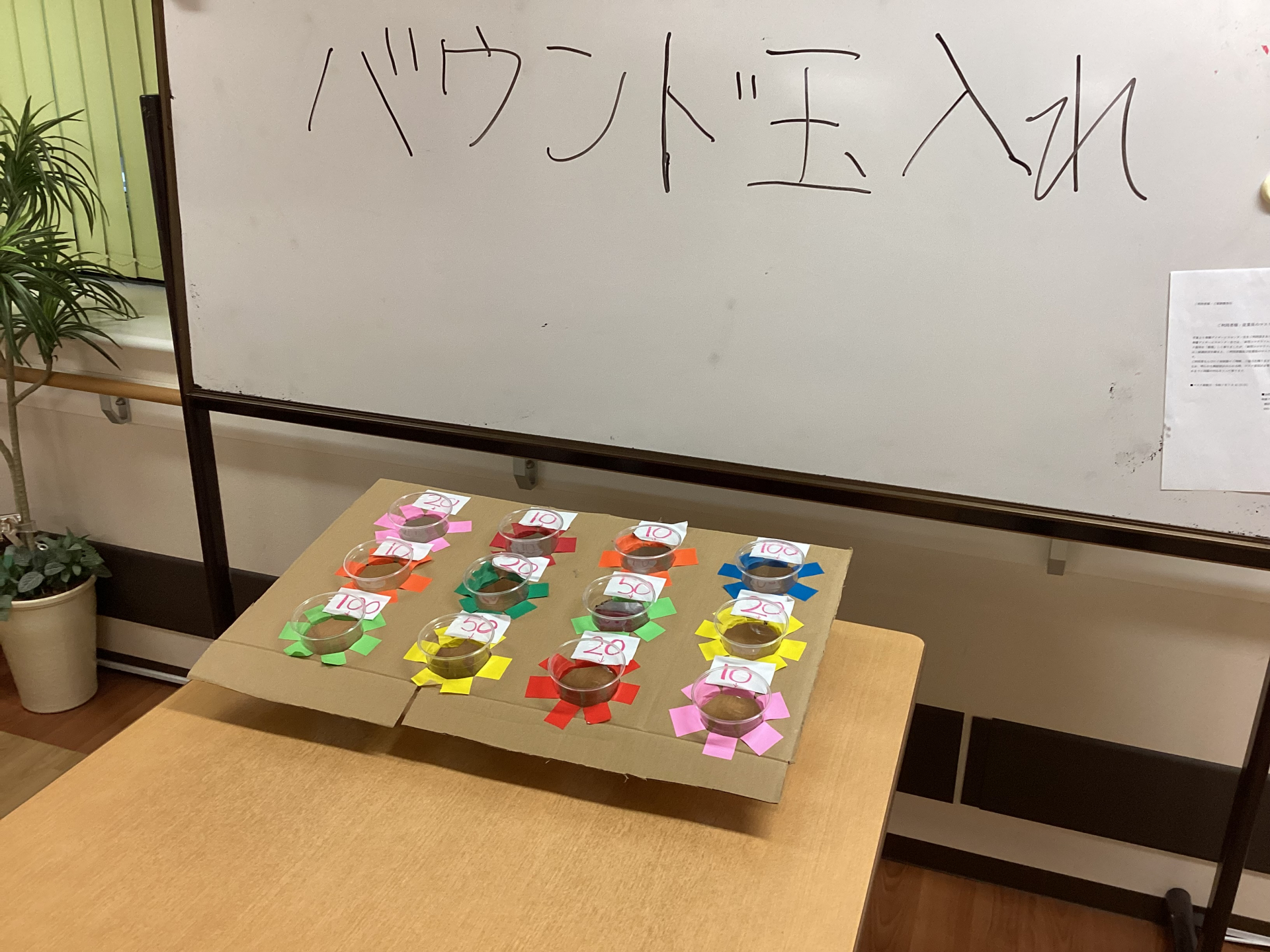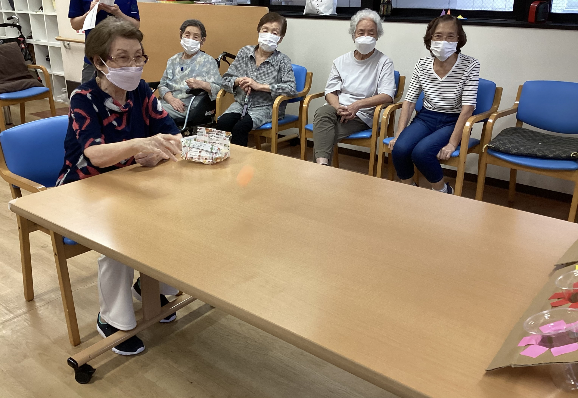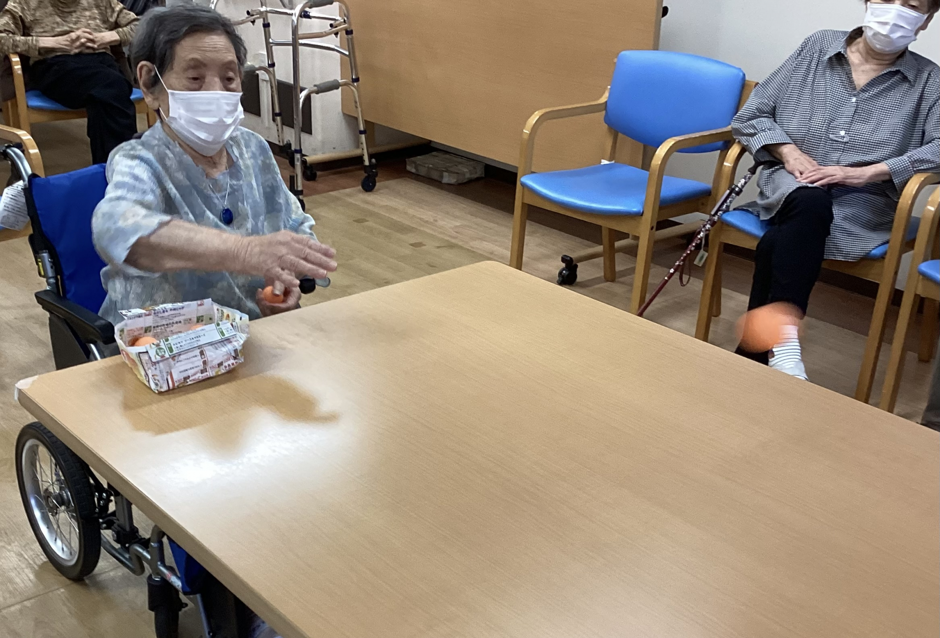 本日、セン北デイでは午後のレクとして、バウンド玉入れというゲームを実施致しました。レクの様子をご紹介致します。