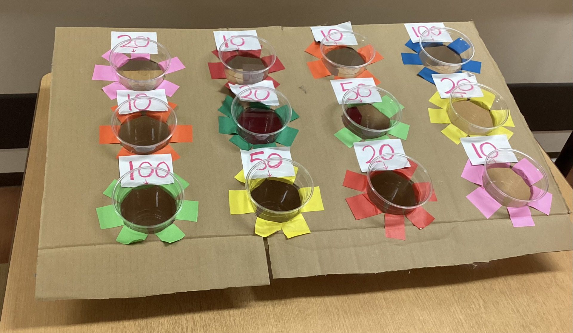 バウンド玉入れとは、次の写真の様な穴の空いたボードを机の上にセットして、ゲーム参加者の方に机の反対側から椅子に座ったままでピンポン玉を投げて頂き、バウンドさせたピンポン玉をボードの穴に入れて頂きます。