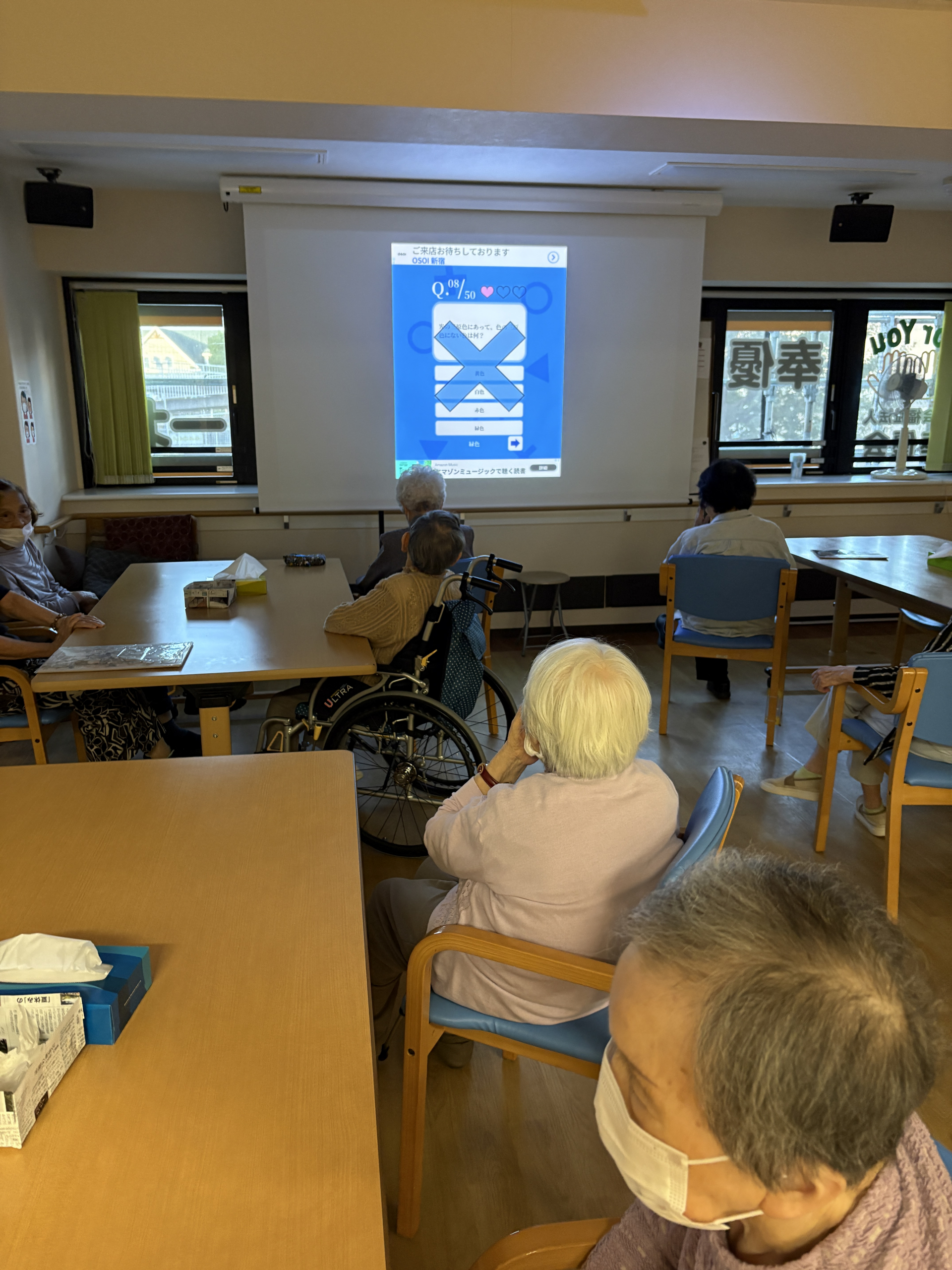 (前の方は画面が明るくみずらいので電気を暗くしてクイズを行っています)