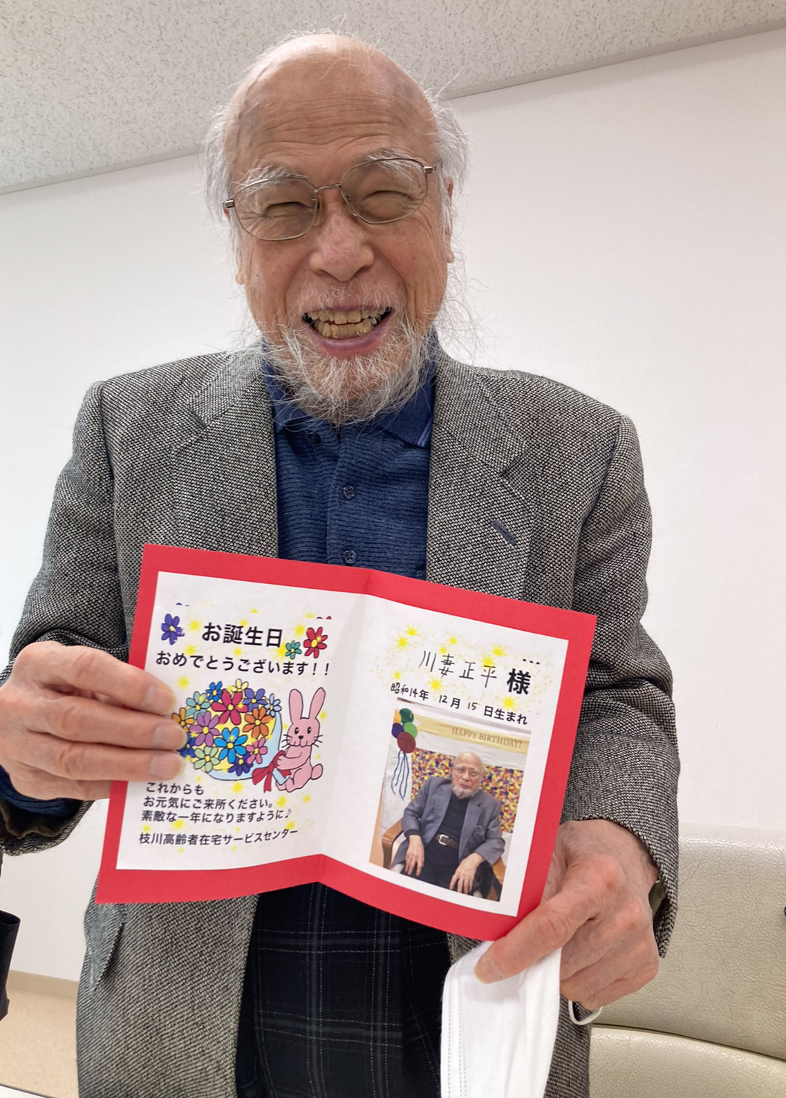 こんにちは。枝川高齢者在宅サービスセンターです。昨日はK様のお誕生日でした。K様は旅、ワンダーフォーゲルをされていて日本全国からアフリカやオーストラリアなど広く旅をされていたそうです。送迎の際などにそういったお土産話を聴かせて頂きます。ちなみに関東近辺でのおすすめは筑波山だそうです。どうぞいつまでもお元気でお過ごし下さい。