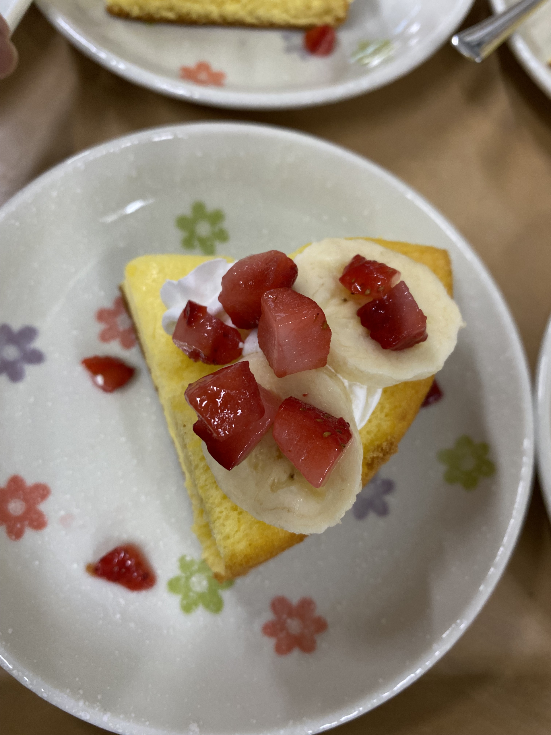 皆様、こんにちは。枝川高齢者在宅サービスセンターでございます。本日は特別な日です!ケーキの上には白いクリームがトッピングされ、赤いイチゴが散りばめられており、とても美味しそうですね。待ちに待ったおやつの時間!!皆様、ハッピーメリークリスマス。(プスパ)