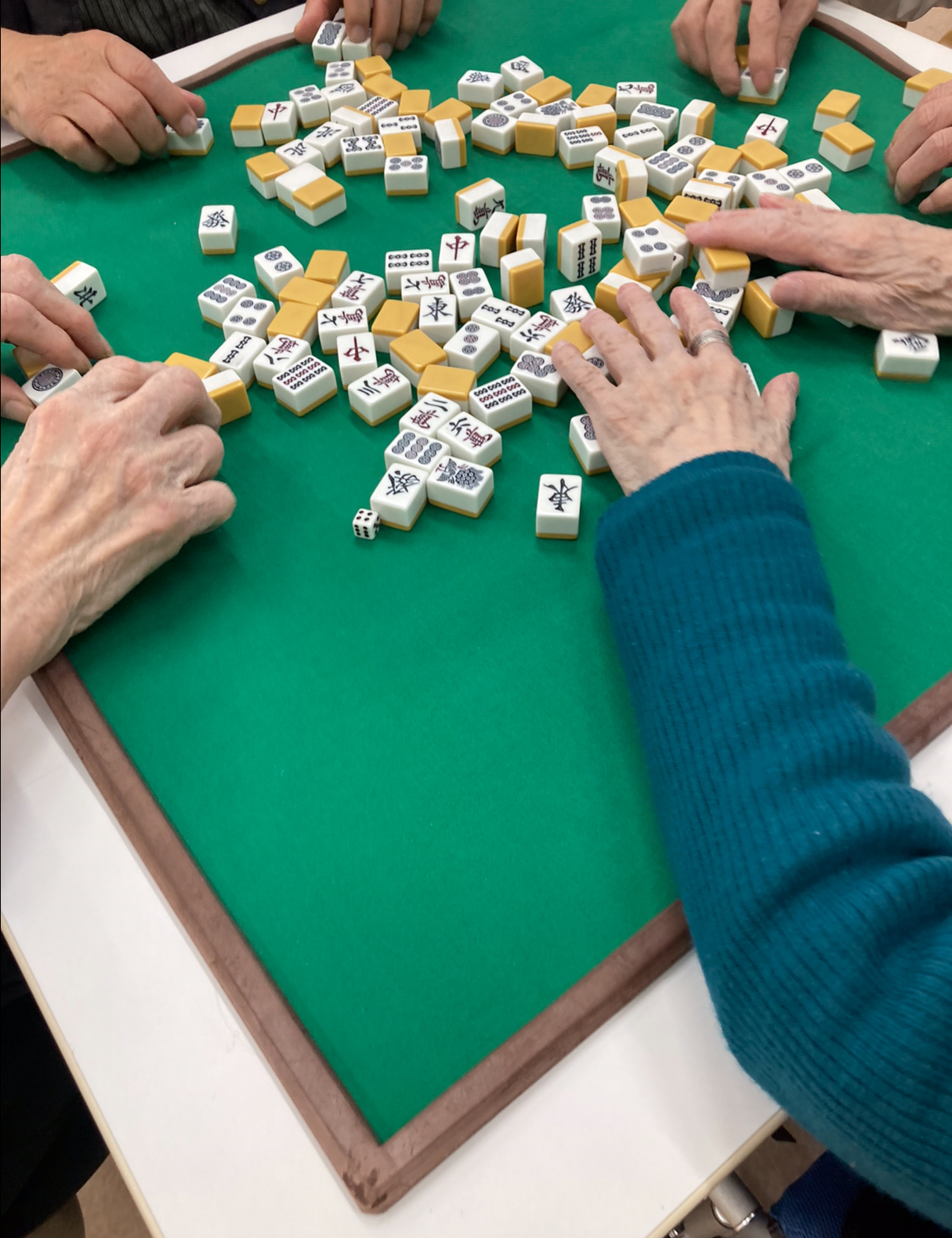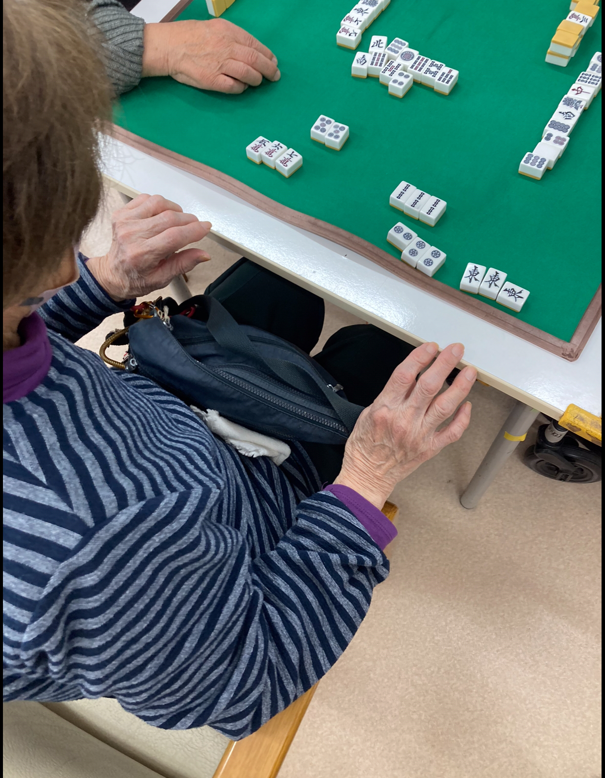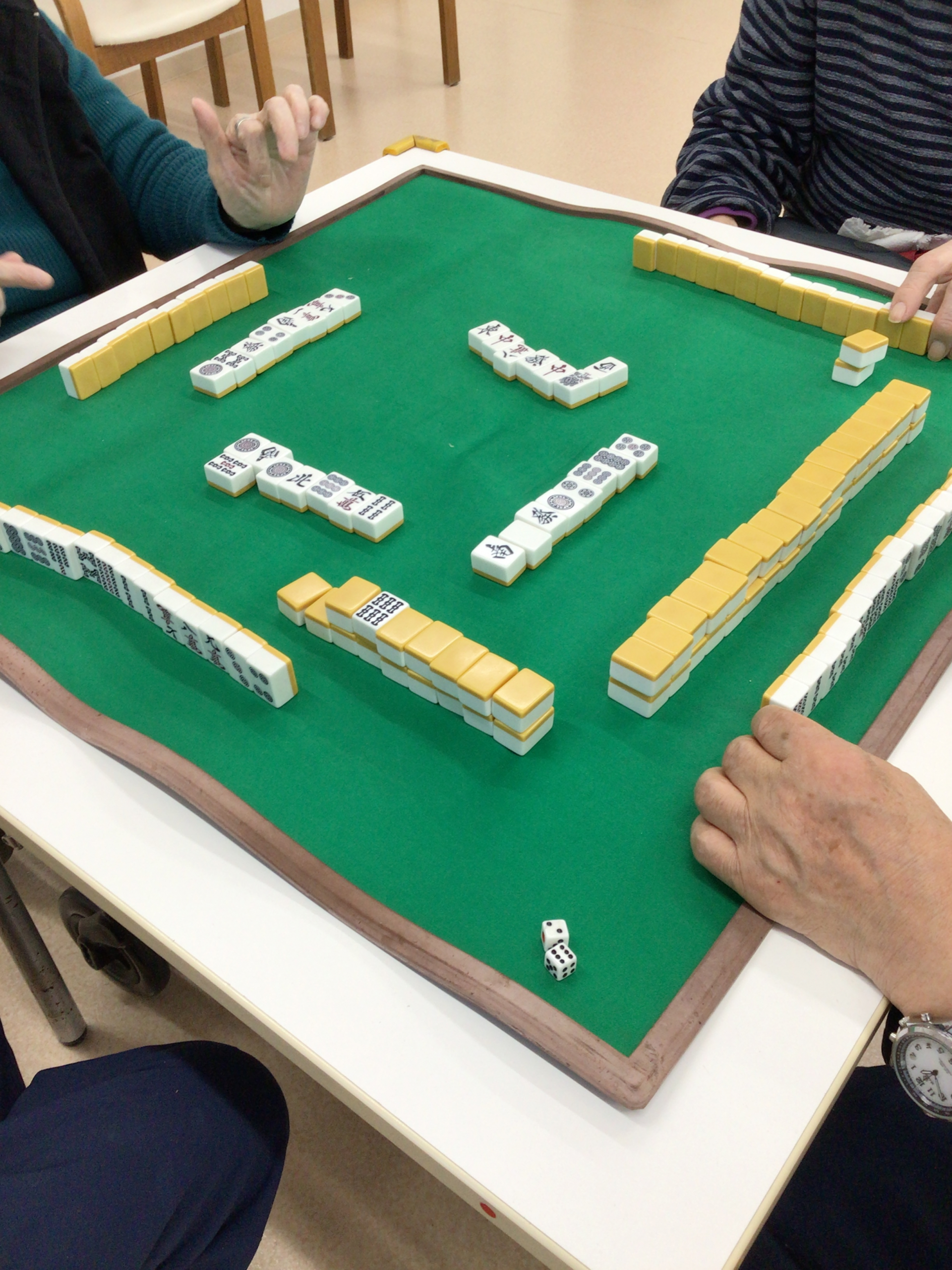 こんにちは。枝川高齢者在宅サービスセンターです。今週から午後の時間を使って麻雀🀄️の時間が出来ました。最初はルールを思い出す所から。。。ですが次第に慣れて皆様楽しんでいらっしゃいました。画像はA様が風牌(東)とリャンピンをポンしてアガっている所です。またのご来店お待ちしております。