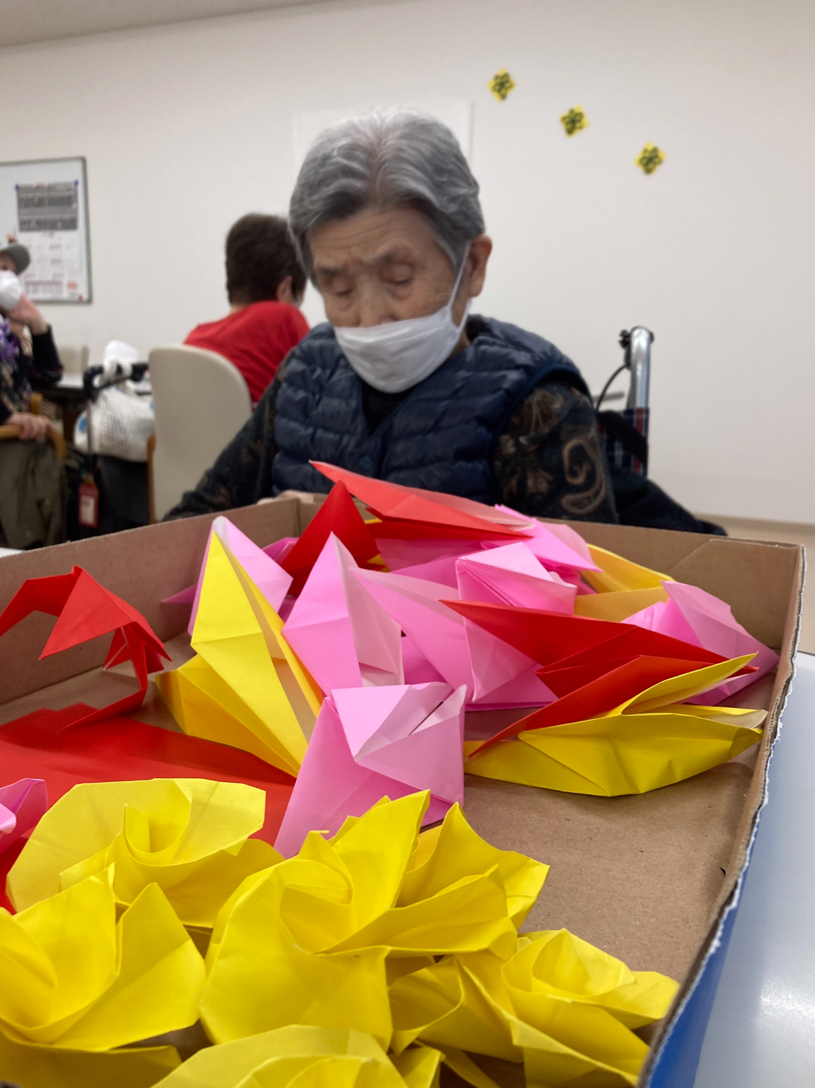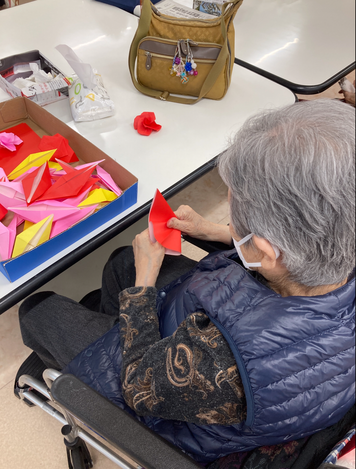 こんにちは。枝川高齢者在宅サービスセンターです。今月のK様の作品は「薔薇」しかし箱の中には鶴の途中までの部分が沢山入っています…すると「(薔薇と鶴は)途中まで一緒なのよ」と教えて下さいました。こんどはここからどの様にバラになっていくのか教えて貰おうと思います。