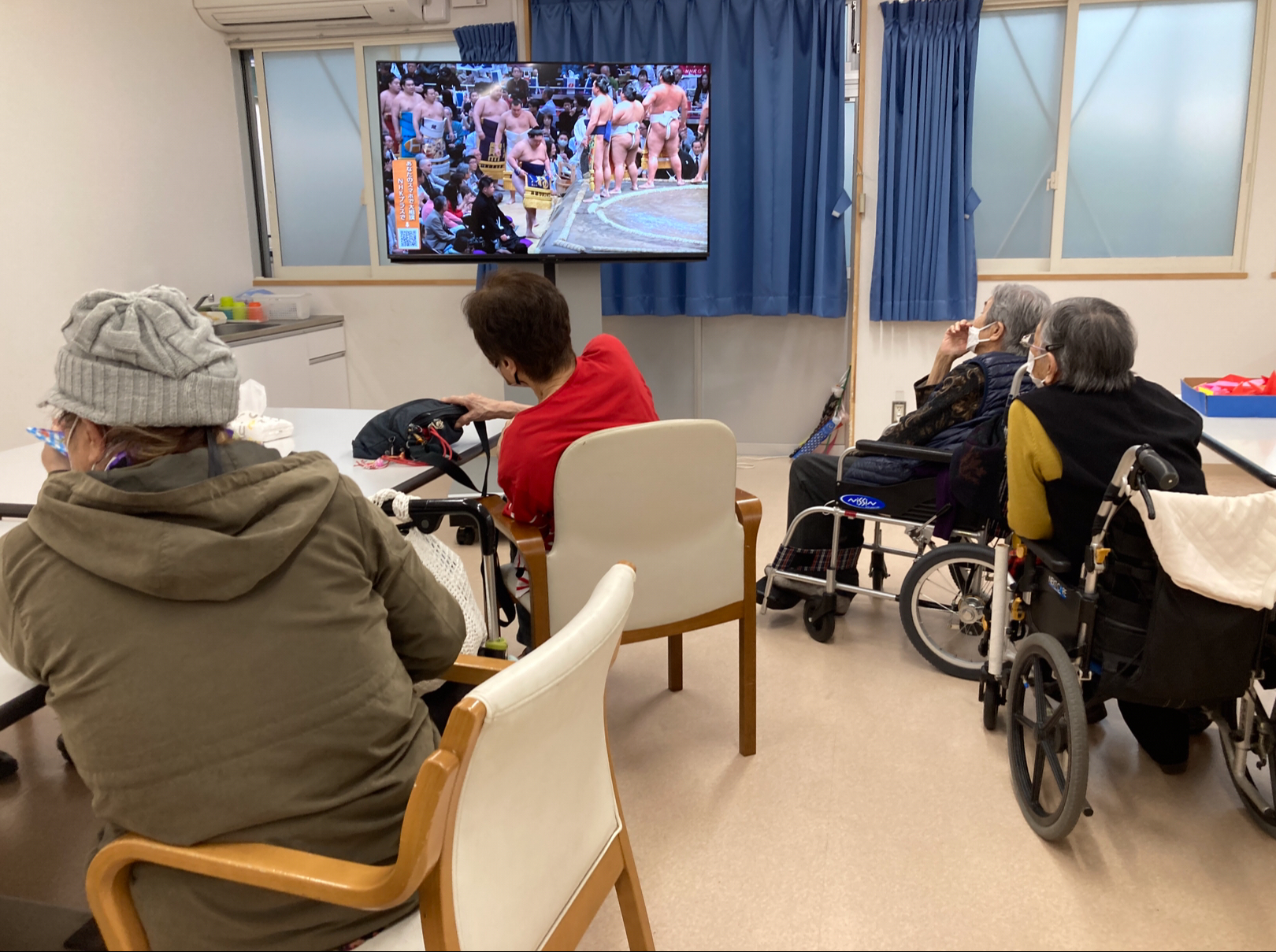 こんにちは。枝川高齢者在宅サービスセンターです。お帰り前の時間はテレビを見られる方が多いですが一番人気は相撲です。今行われているのは年6回ある「本場所」の内の夏場所(五月場所)と呼ばれるもので千秋楽は26日です。次の七月場所までは二ヶ月程あります。いつでも開催されてるわけではないのですね。