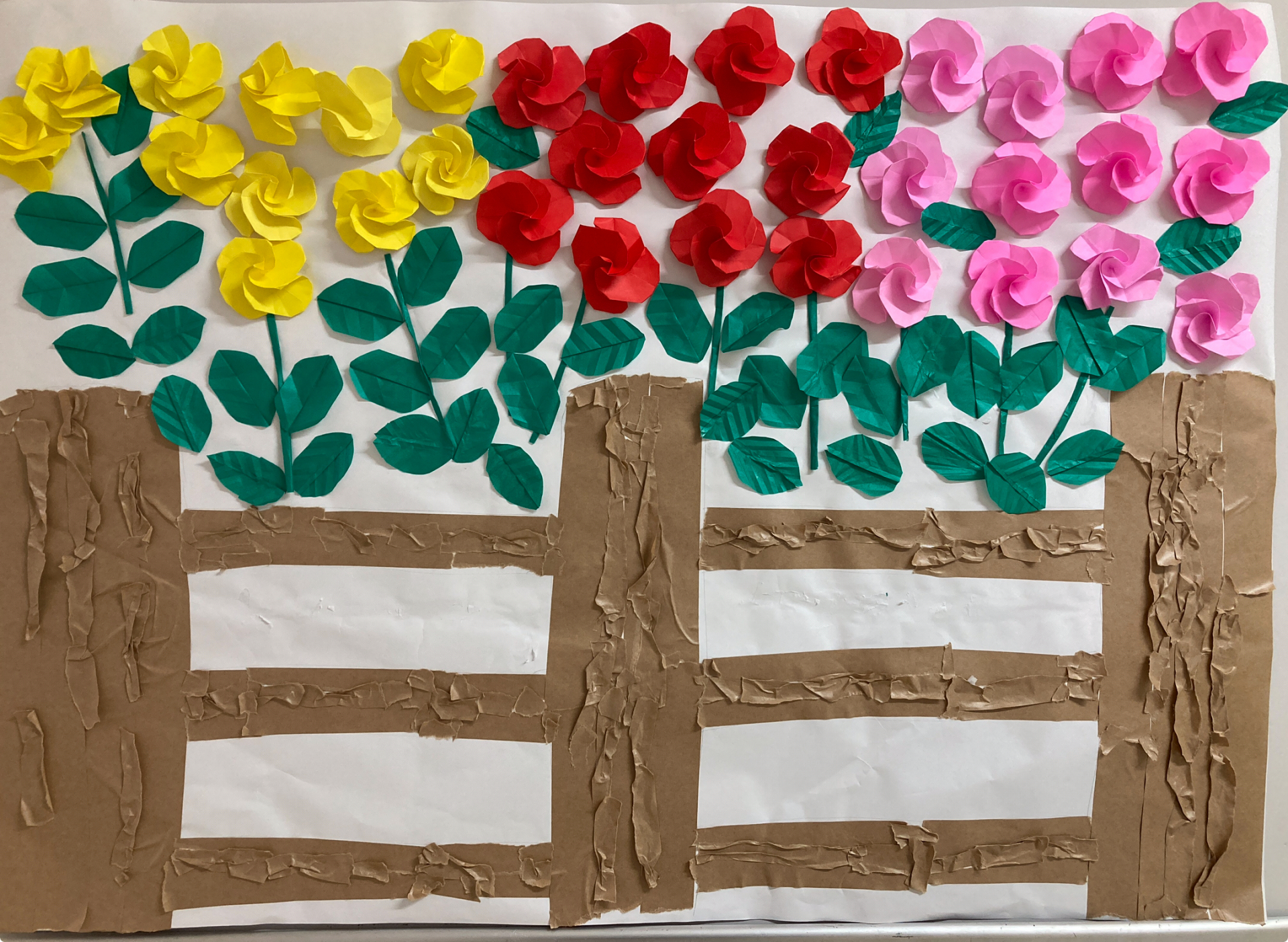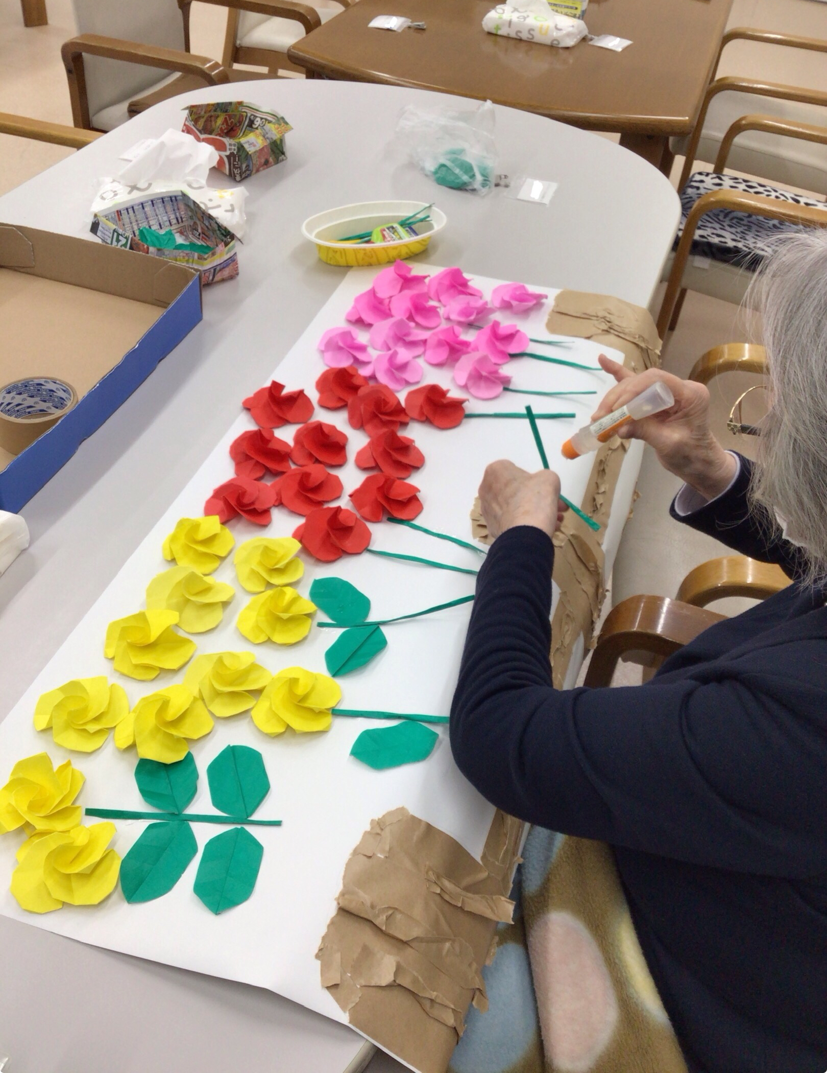 こんにちは。枝川高齢者在宅サービスセンターです。以前バラを皆様に折り紙で沢山作って頂きました。今回はそのバラを使って花壇を作ってみました。お手伝いして下さりありがとうございます。素敵なバラ園が出来ました!