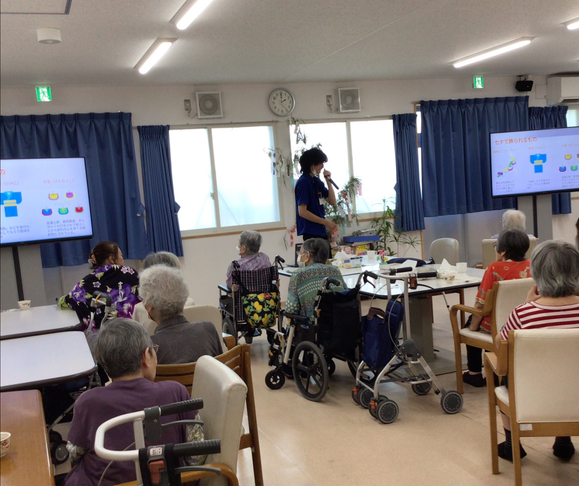 皆様、こんにちは。枝川高齢者在宅サービスセンターです。今日は七夕ですね。レクの時間には職員が七夕の歴史などをスライドを使って紹介しました。日本古来の風習に中国の文化が合わさって江戸時代頃に今の様に5色の短冊にお願い事をする様になったそうです。最後には七夕クイズも出題しました。
