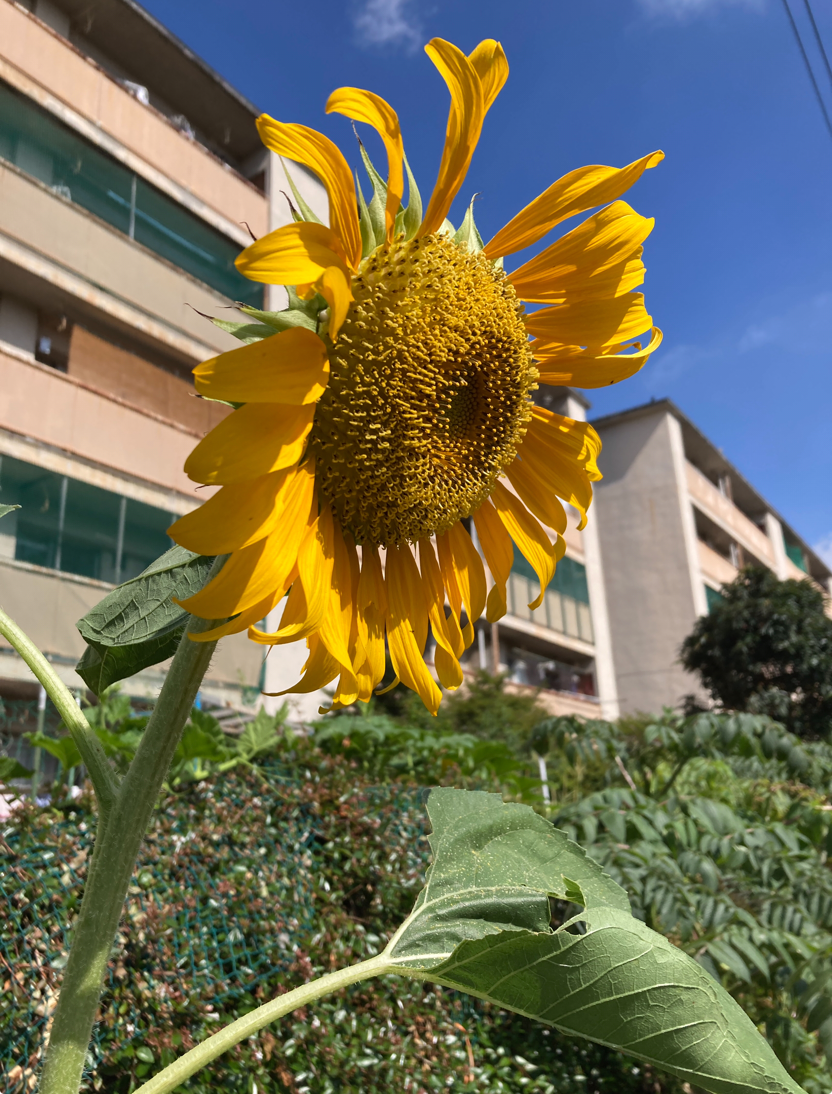 皆様こんにちは。枝川高齢者在宅サービスセンターです。今日の送迎の時、辰巳団地にひまわりが咲いていました。梅雨ももう時期あける手前に夏の風物詩が一足早くお目見えです。ちなみに食用にもなるひまわりの種は中心の黒い円部分、筒状花という所から穫れるそうです。