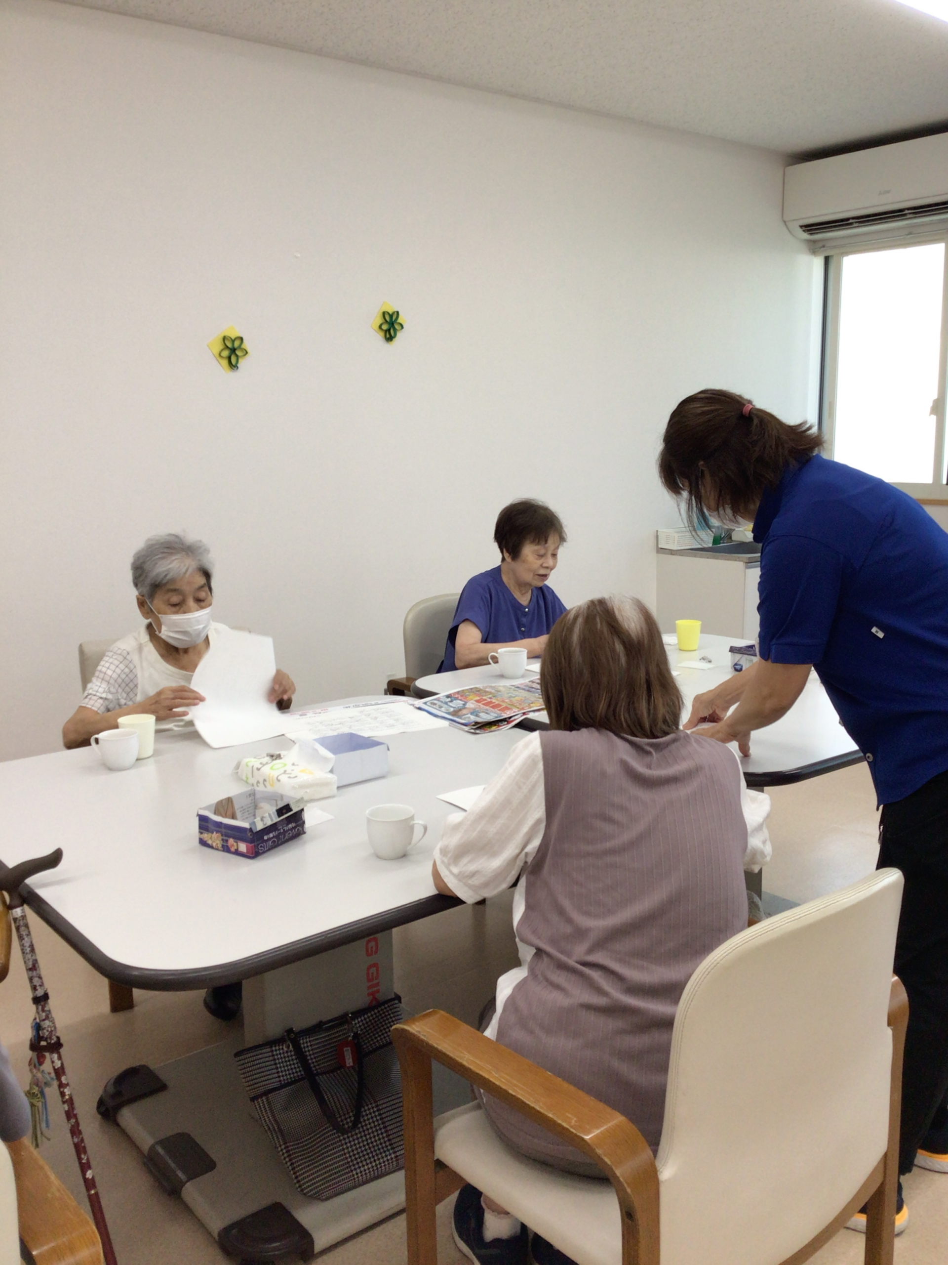 皆様、こんにちは。枝川高齢者在宅サービスセンターです。午前の体操前に8月のプログラム表を二つ折りにしてもらいました。ご新規のO様にも手伝って頂いてみんなで話しながらサクッと終わらせる事が出来ました!!