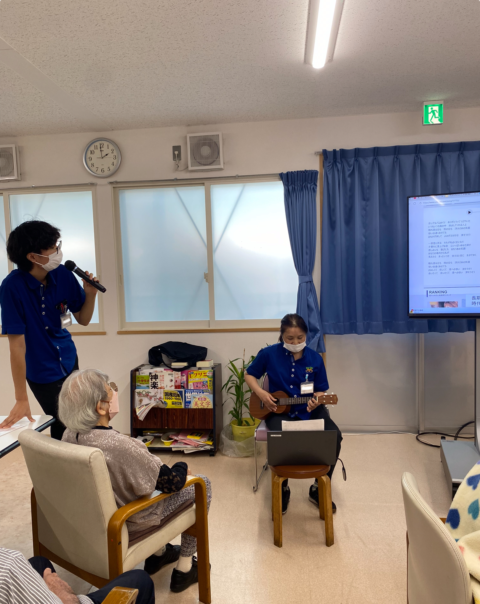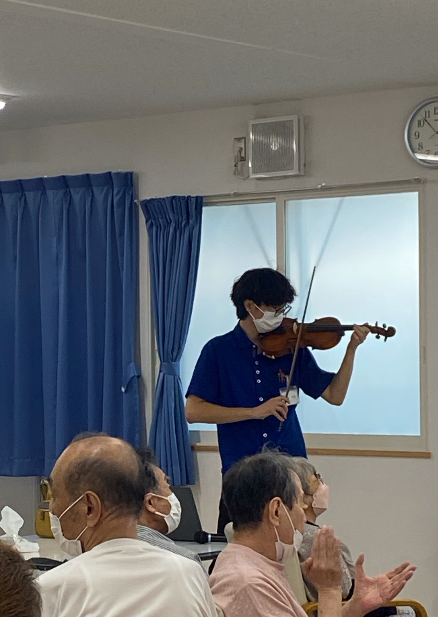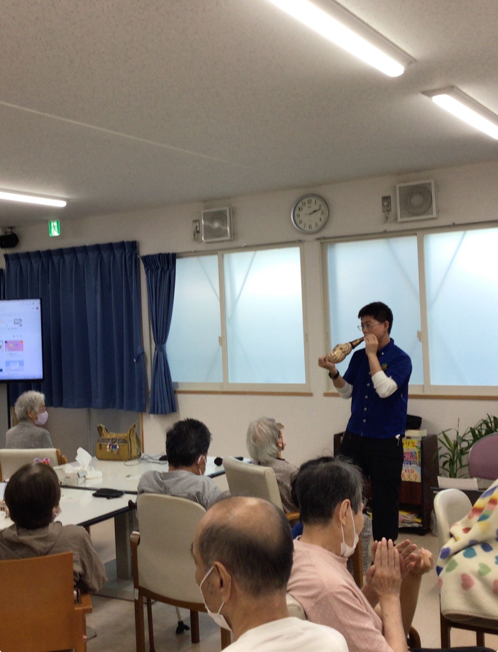 皆様、こんにちは。枝川高齢者在宅サービスセンターです。昨日は敬老の日、祝日です。レクもいつもとちょっとだけ違う物になりました。O職員のバイオリンに合わせて利用者の皆様と「むすんでひらいて」の手遊び歌をしたり、思い出(久しき昔)LongLongAgoの演奏や、M職員のウクレレで「なだそうそう」「カントリーロード」「上を向いて歩こう」計3曲の弾き語りとE職員の法螺貝の試し吹きなどなど…皆様に喜んで頂けたら幸いです。