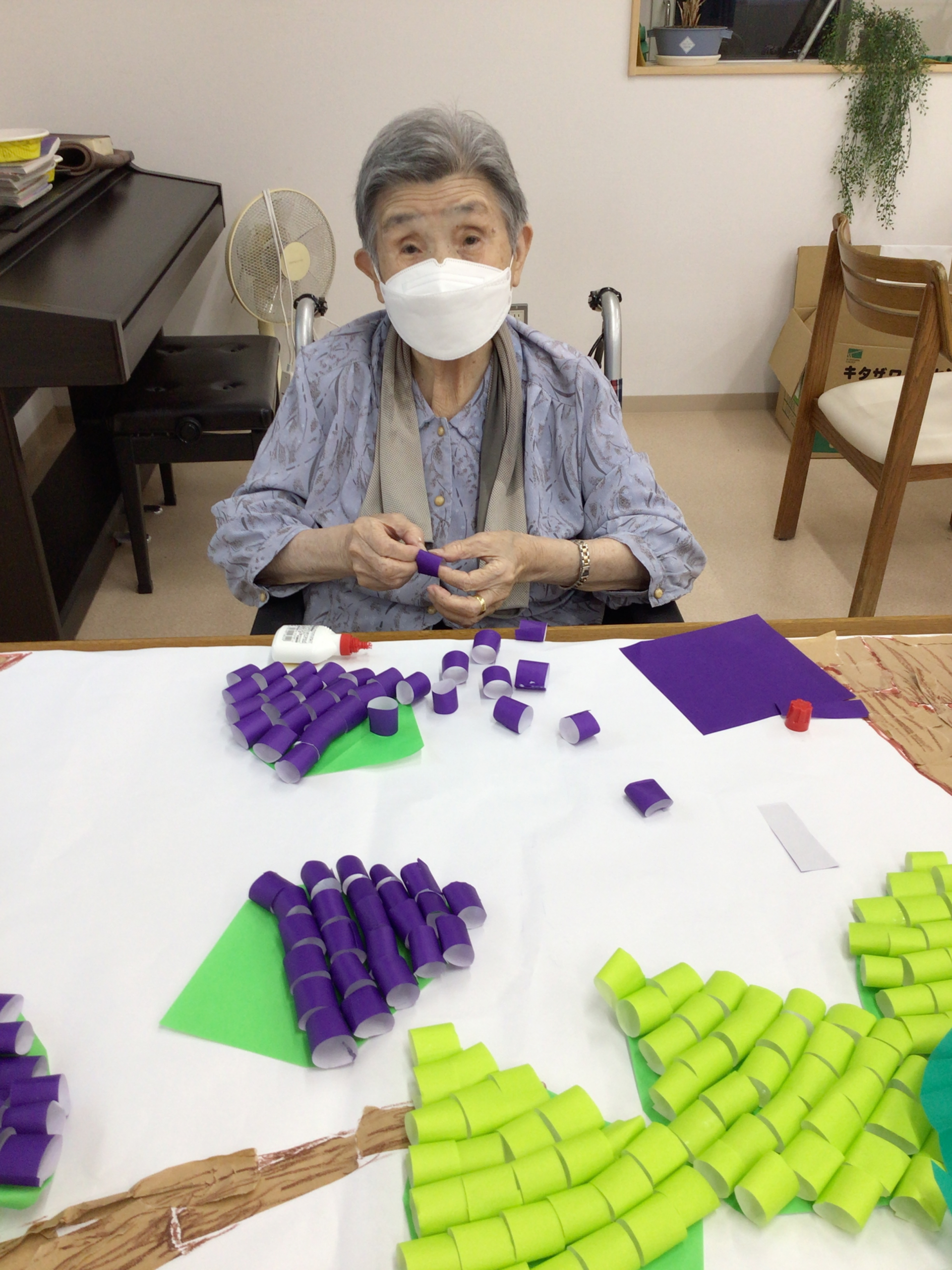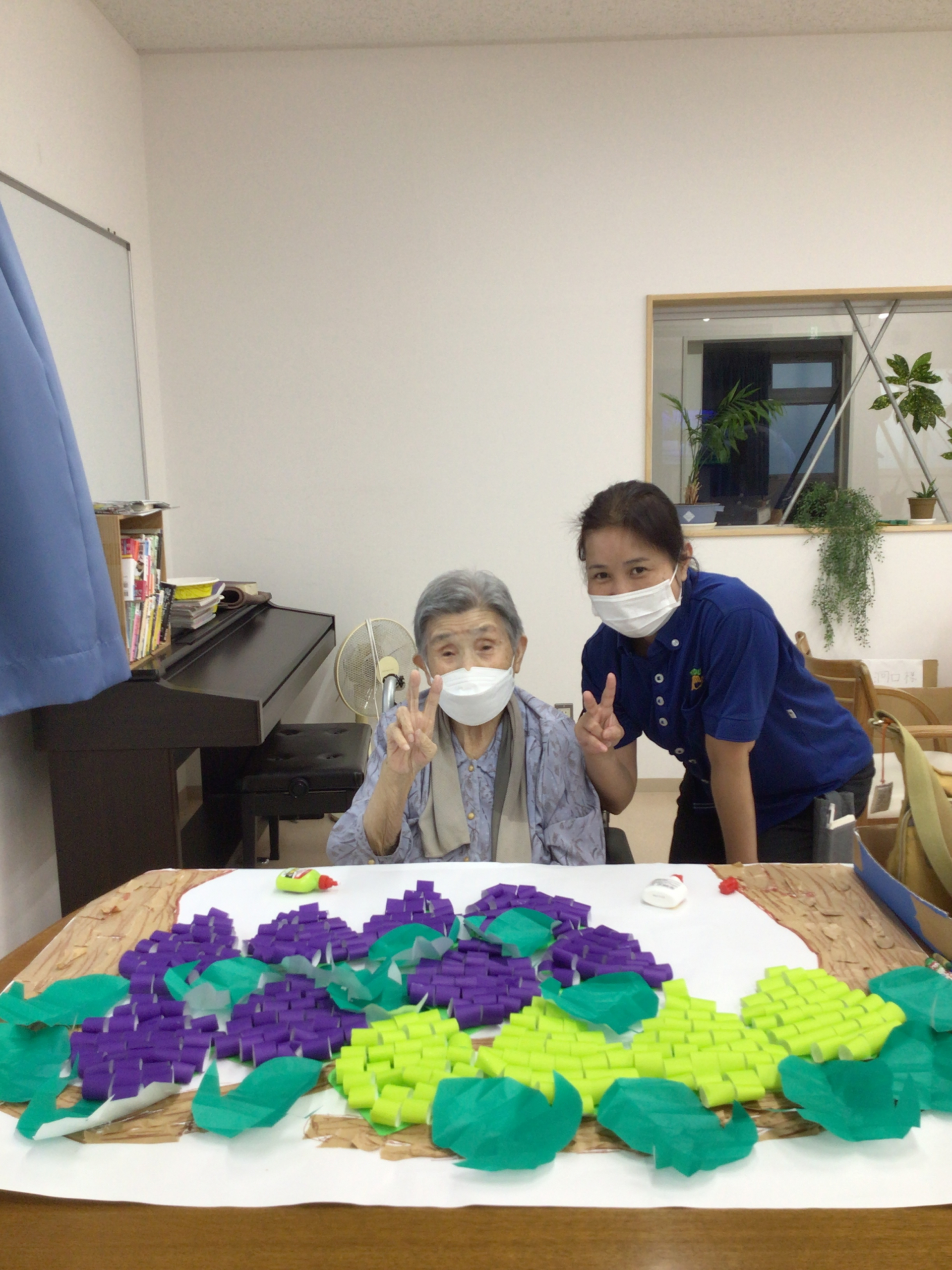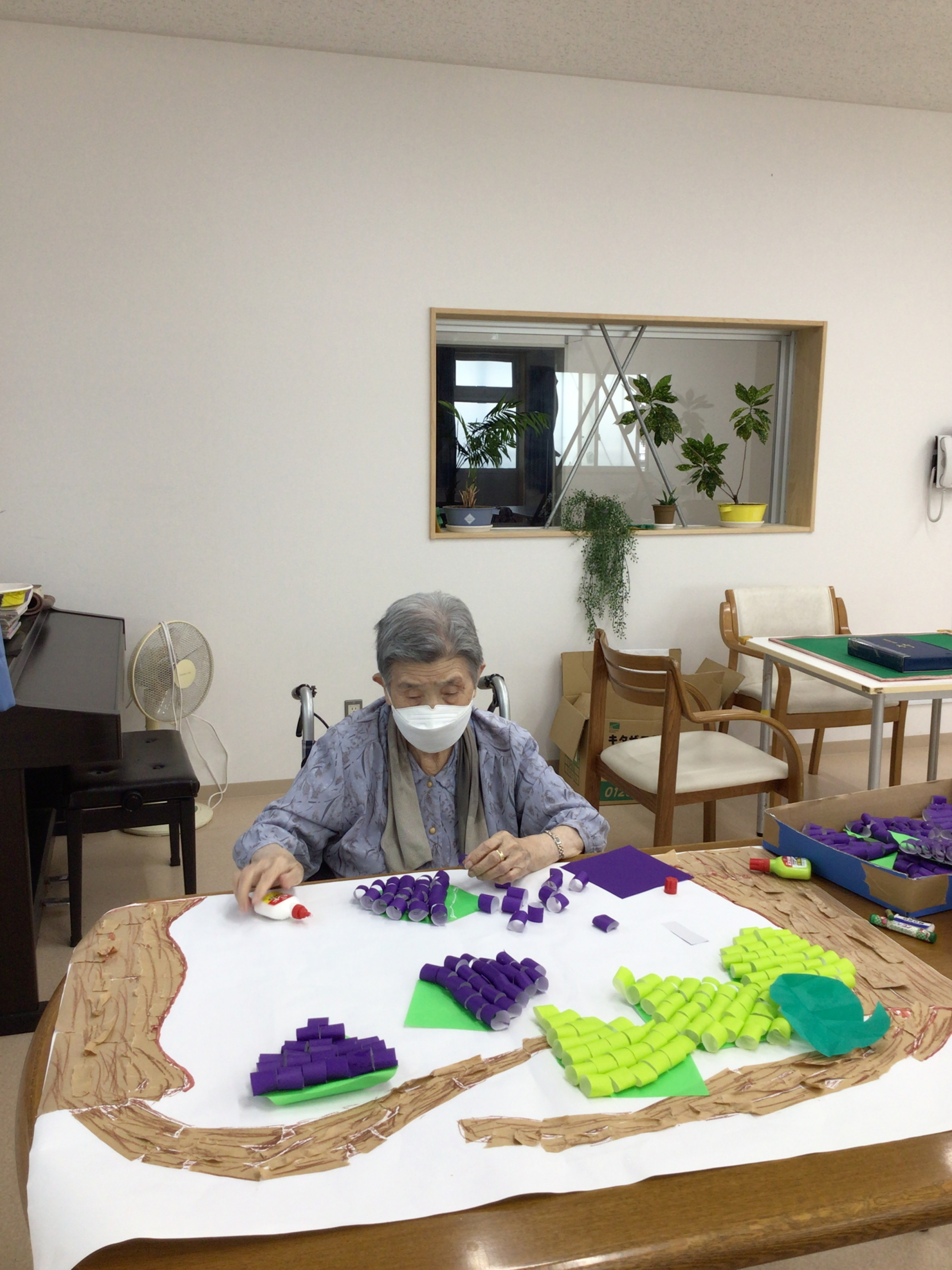 皆様 こんにちは。 枝川高齢者在宅サービスセンターです。本日は K様がぶどう飾り作成中の様子の写真を撮りました。秋の味覚「ぶどう」をテーマにした飾り作りを行いました。色とりどりの折り紙を使い、1粒ずつ丁寧に貼り付けながら、K様集中して作業に取り組まれていました。指先を使う工作は、脳の活性にもつながります。いつもお手伝いしてくださりありがとうございます。