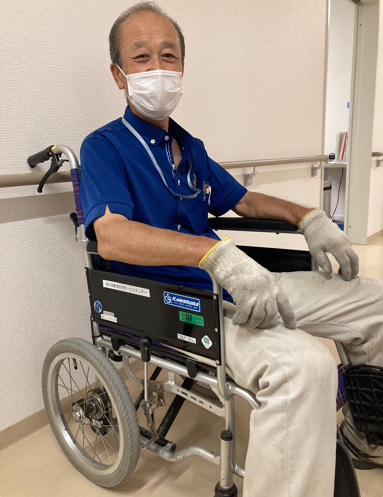 こんにちは。枝川高齢者在宅サービスセンターです。今日の送迎の終わりに車いすの座りご心地を確かめるドライバーのM氏。勤続7年の大ベテランさんです。いつも安全運転ありがとうございます!