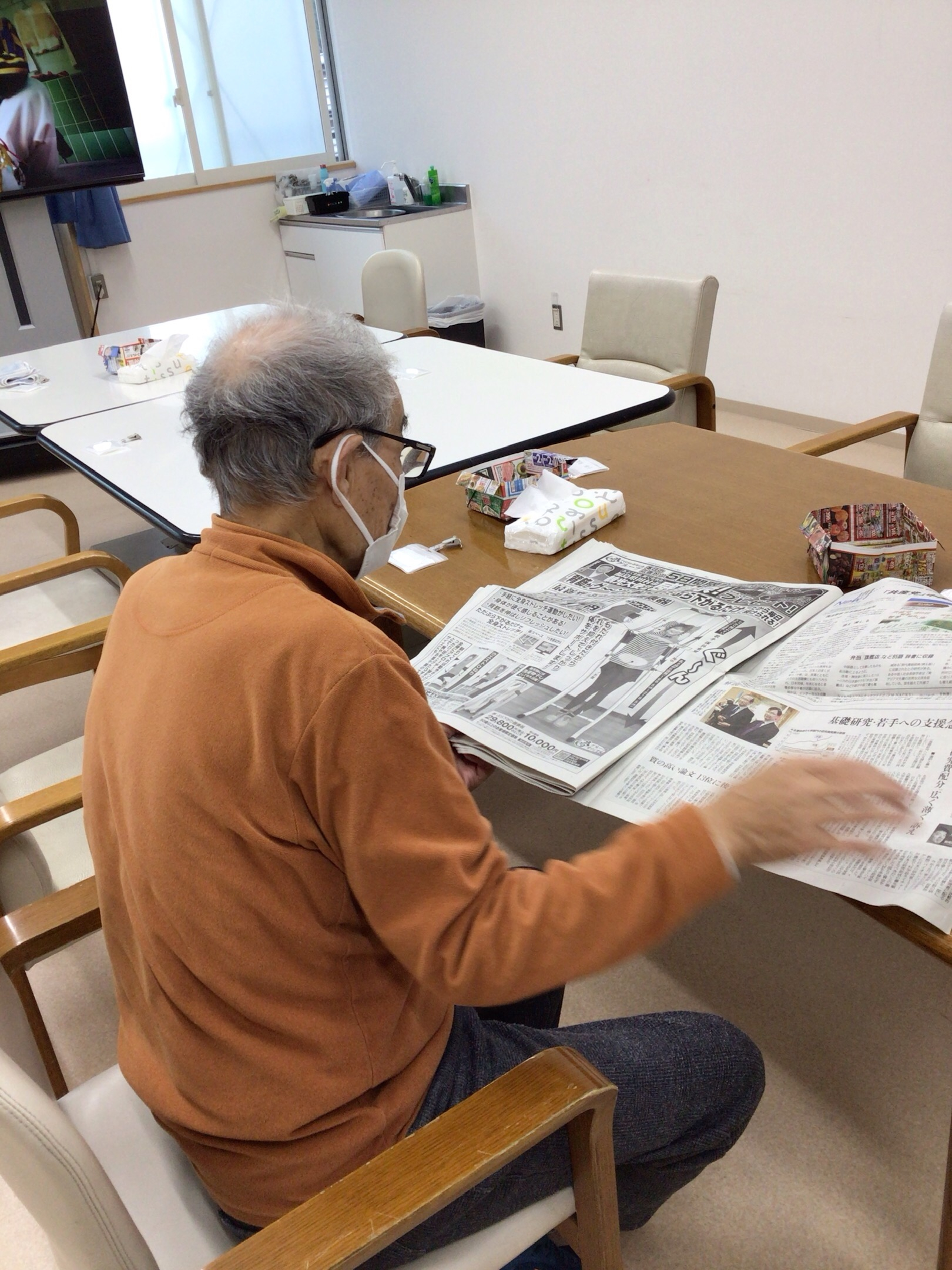 皆様、こんにちは。枝川高齢者在宅サービスセンターです。I様が朝の時間新聞を読まれています。どこを良く読みますか?と尋ねると「コラムとかスポーツなんかは良くみるかな」との事。今は新聞よりもインターネットでニュースを知る事が多くなりましたが新聞は今日の一面から社説にスポーツなど様々な情報が詰まっているのが魅力です。自分の知らなかった事に出会えるのが良いですよね。ジャンルの違う情報を少しづつ頭の中に入れて行くのは脳の色々な部分に刺激を与えるのでとても重要な事です。私も久しぶりに新聞を手に取ってみたいと思います。