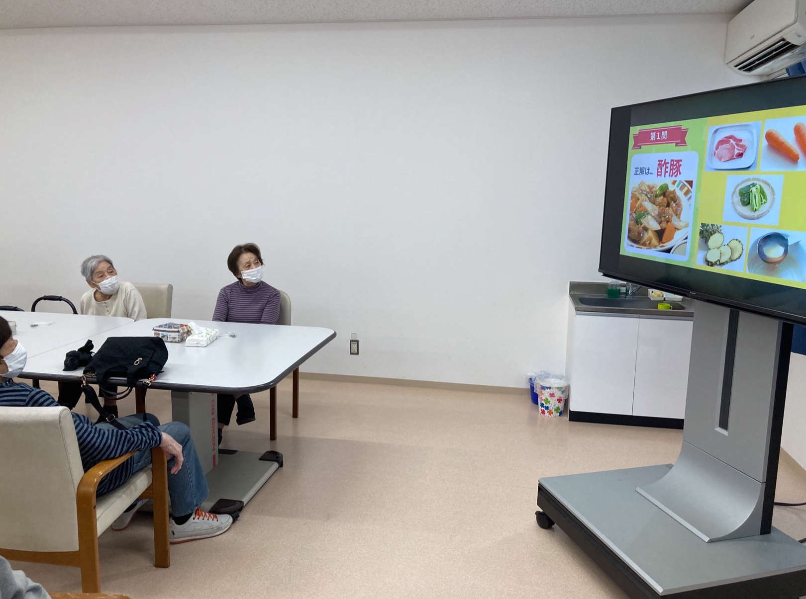 こんにちは。枝川高齢者在宅サービスセンターです。突然ですが皆様は酢豚にパイナップルは入れますか?今日の脳トレは食材から料理を当てるクイズをやってみました。カレーや酢豚などの定番からチーズケーキにパエリアなど普段あまり作らないであろう物まで出ていました。同じ食材でも少し調味料を変えたり調理法を変えると違う料理になるのが面白い所ですよね。今度は食べた事のある料理からどんな思い出があるのかを聞いてみたいなと思います。