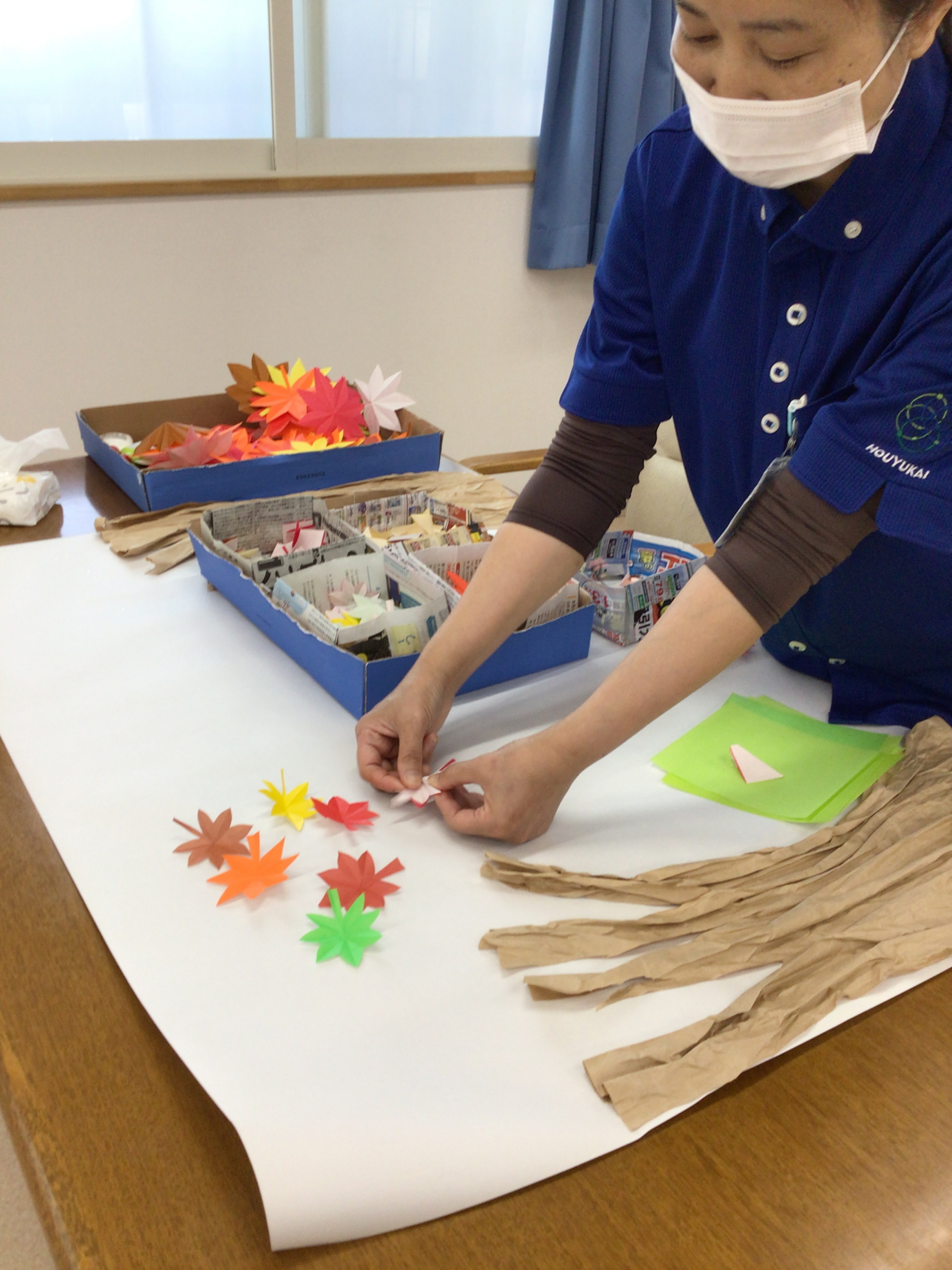 こんにちは。枝川高齢者在宅サービスセンターです。11月の壁面工作は紅葉。秋深まり赤くなる葉っぱ、綺麗ですよね。今年はどんな感じになるのでしょうか?また、K様に紅葉の葉を大小切り分けて頂いています。K様いつもありがとうございます♪