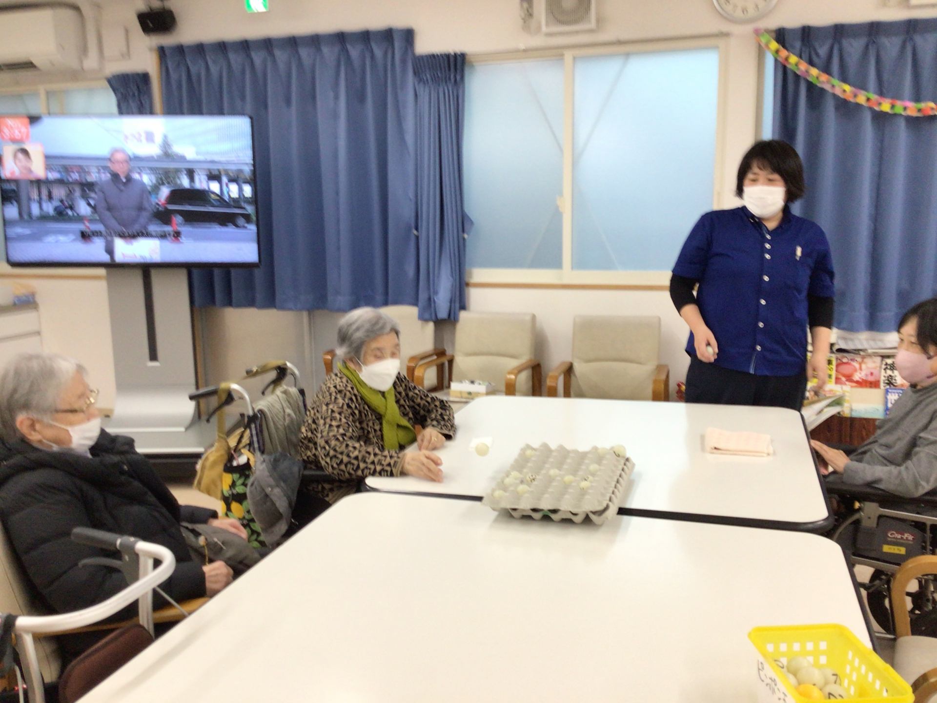こんにちは。枝川高齢者在宅サービスセンターです。世の中には合いそうで合わなかったり、逆に合わなそうなのにぴったりなんていう事があります。今回のゲームは後者の方でたまごパックにピンポン玉がピッタリ収まるんです。しかし調べて見るとデイサービス的には結構有名みたいで。。。また一つ新しい発見をしました、というご報告でした。ゲーム的にはピンポン玉をテーブルに投げて、跳ね上がる勢いで指定されたたまごパックの場所に入れていくというゲーム。目で入れる場所を見てどれくらいの力加減でバウンドさせるかを決めるので感覚を掴むまで意外と大変だったり。派手さはありませんが、地味に感覚と身体の制御を連動させるので脳の活性化には持ってこいですね。(後でお迎えに上がったドライバーさんも混ざって遊んでました)