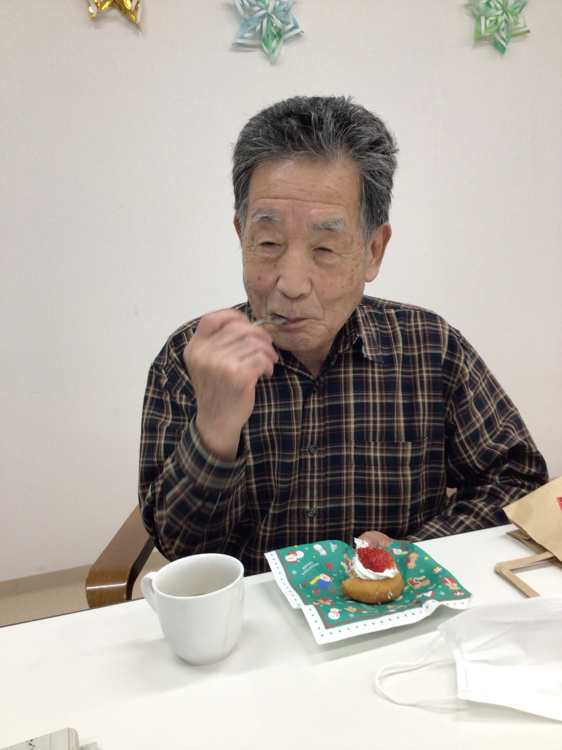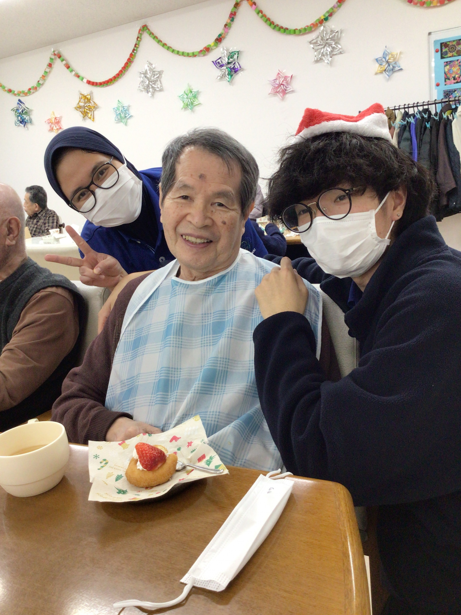 こんにちは。枝川高齢者在宅サービスセンターです。ここ20年で25日が雨の日は一度だけという珍しい雨のクリスマス2日目。あわてんぼうのサンタクロースとジングルベルを歌ってからビンゴ大会を行いました。おやつはドーナツの上にクリームとスライスしたいちごに銀砂糖をトッピング。いつもと少し違ったおやつに少しでも喜んで頂けたら幸いです。来年は新しい枝川でクリスマスを皆んなで楽しみましょう!
