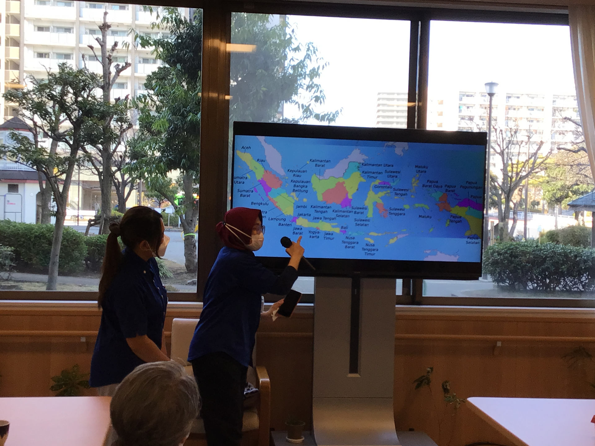 皆様、こん日は。枝川高齢者在宅サービスセンターです。今日は、私たちがインドネシアに住んでいる地理的な位置をご紹介します。そうです、私たちはインドネシア出身ですが、バスで12時間で行ける大都市から来ています。新しく入って来てくれた二人はジャワ島、つまり私は西ジャワ、イルハムさんがジョグジャカルタ、ササさんがマラン出身です。日本の東京と名古屋、大阪みたいな関係に近いのかも知れません。しかし、私たちの文化、言語、そして背景は全く異なります。私たちを結びつけるのはインドネシア語だけです。私たちの地域の言語は似ているものもあれば、全く理解できないものもあります。それはとても興味深いのです。ふとした偶然で同じ場所で働く事になった事に驚いていますが共に働き支え合っていきたいと思います。