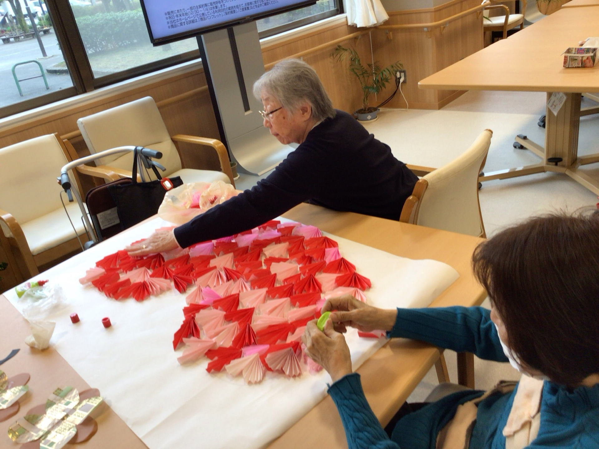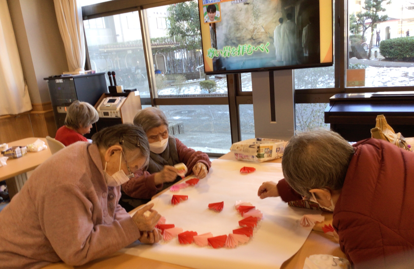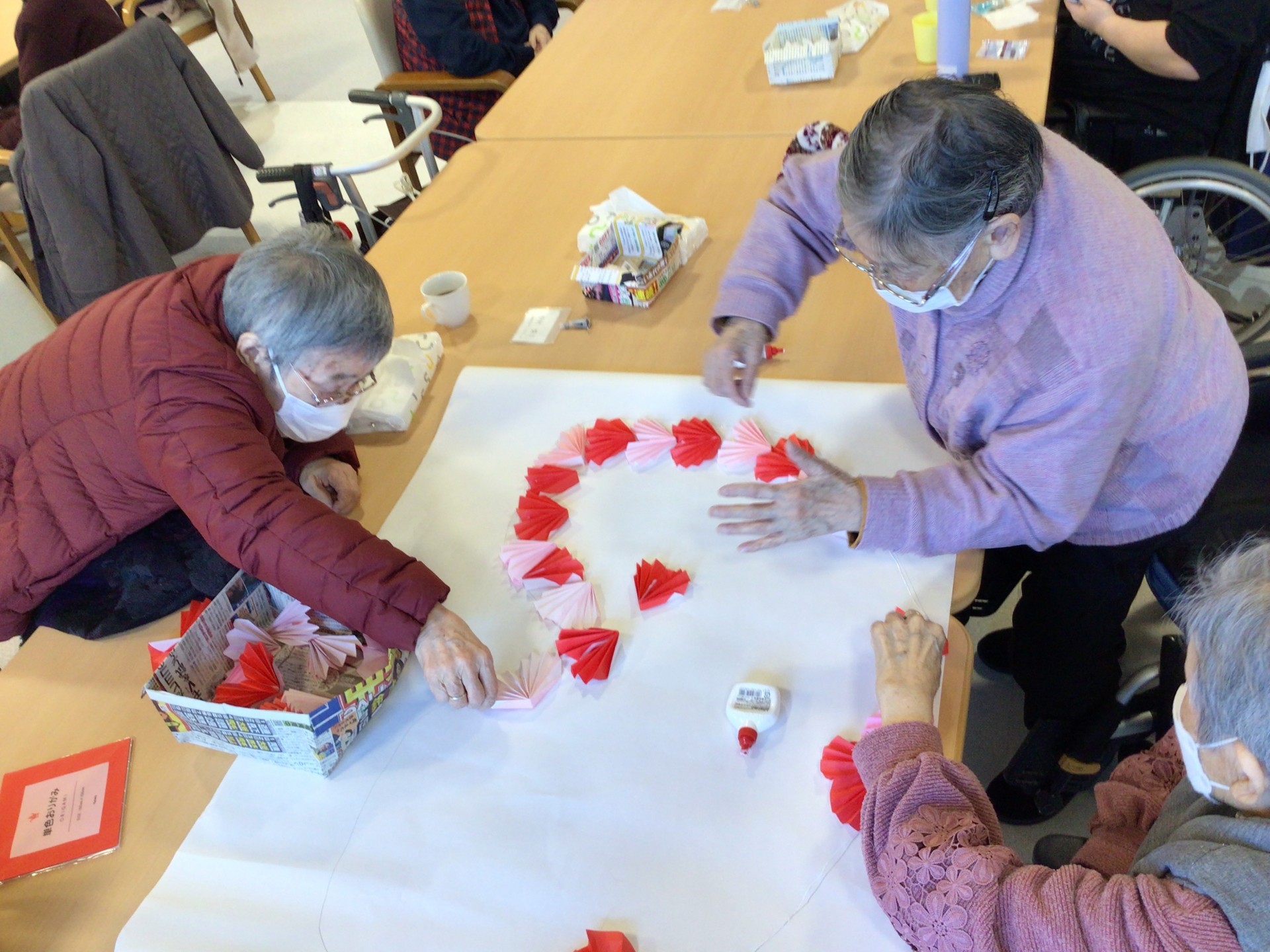 こんにちは。枝川高齢者在宅サービスセンターです。お昼ご飯の後皆様に2月の壁飾りのお手伝いをしてもらいました。折った折り紙をハート型に埋めて行きます。バレンタインももう直ぐですね。