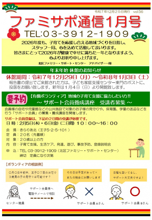 2026.01.30 土日も対応しております ファミリー・サポート 2026.01.29 【ファミリー会員様へ】サポートできない活動についてのご確認 お知らせ 2026.01.28 もうすぐ節分ですね。 ファミリー・サポート 2026.01.27 現在 令和7年度 利用者満足度調査実施中です。 ファミリー・サポート 2026.01.25 【初めての方へ】「サポート会員登録」に関する疑問 ファミリー・サポート 2026.01.25 「ファミサポ通信2月号」発行しました!! ファミリー・サポート 2026.01.22 城北エリア勉強会 ファミリー・サポート 2026.01.15 【ご報告】あそびのひろば説明会を行いました! ファミリー・サポート 2026.01.10 休館日のお知らせ ファミリー・サポート 2026.01.10 【1月】ファミリー会員登録説明会の空き状況につきまして ファミリー・サポート 2026.01.08 YELLボランティア 募集 ファミリー・サポート 2025.12.28 年末年始のご挨拶 ファミリー・サポート 2025.12.27 「ファミサポ通信1月号」発行しました!! ファミリー・サポート 2025.12.22 休館日のお知らせ ファミリー・サポート 2025.12.10 合同講演会『 発達障害講座 』お申し込み 受付中 ファミリー・サポート 1 2 3 … 34