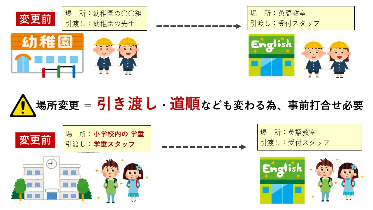 初回の事前打合せでは、両会員様、対象のお子様とで、「幼稚園」→「習い事(英語教室)」の場所・引き渡し者へ紹介、道順をチェック済みのことでしょう。