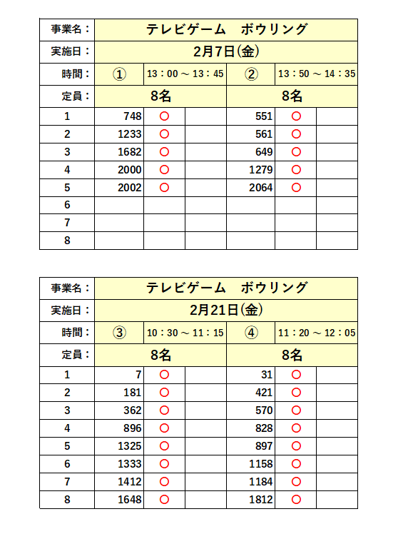 2月「テレビゲームボウリング」の抽選結果発表です。