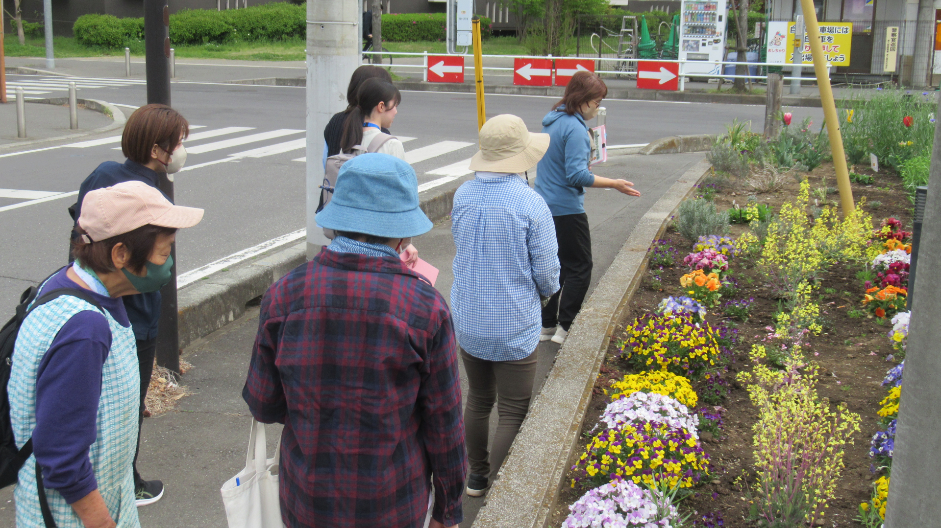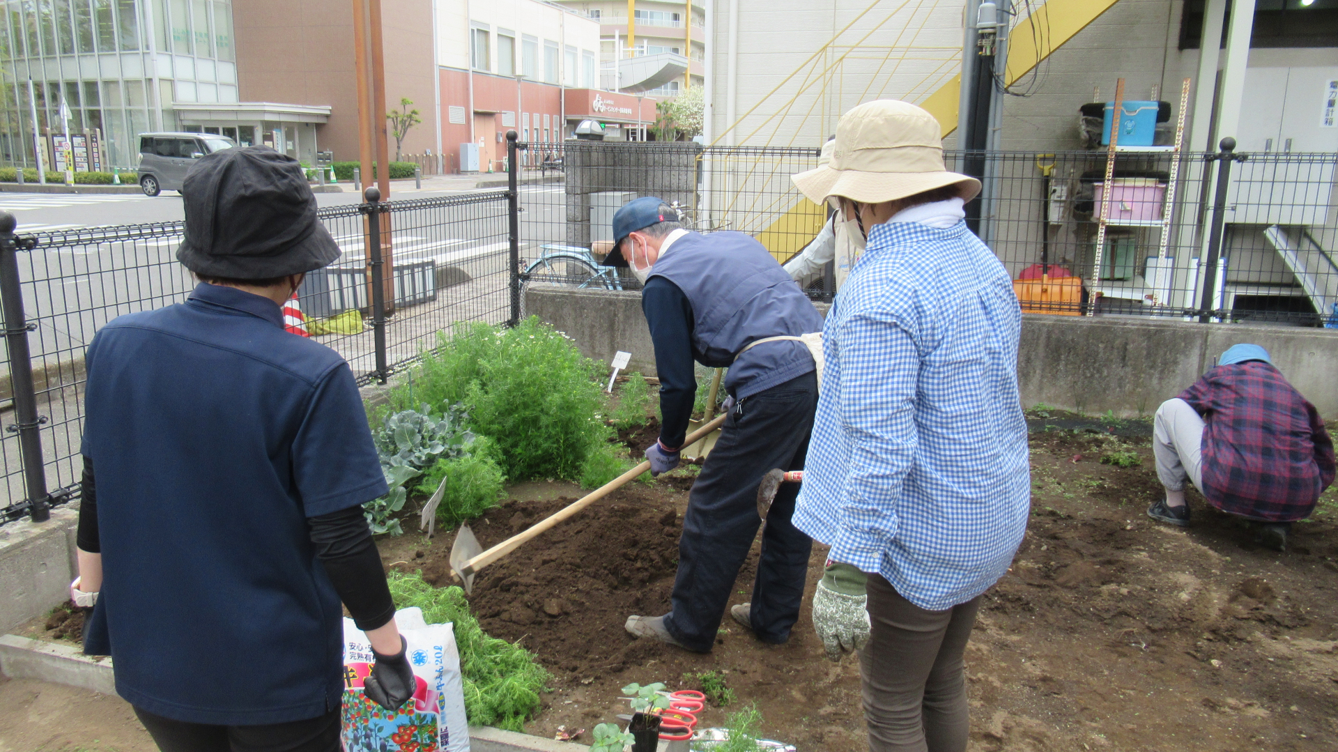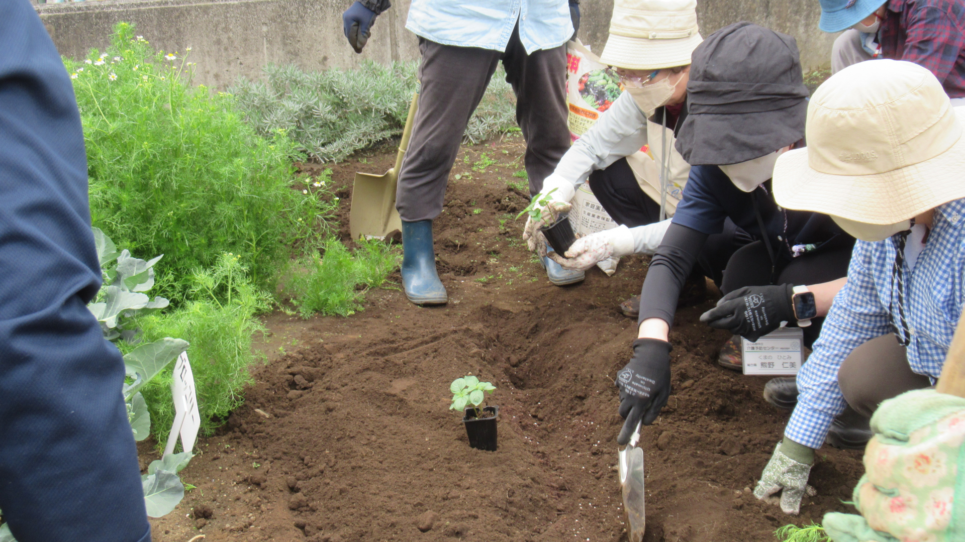 現在の花壇の花を紹介した後、菜園ボランティアの皆さんと青しその植え付けをしました。