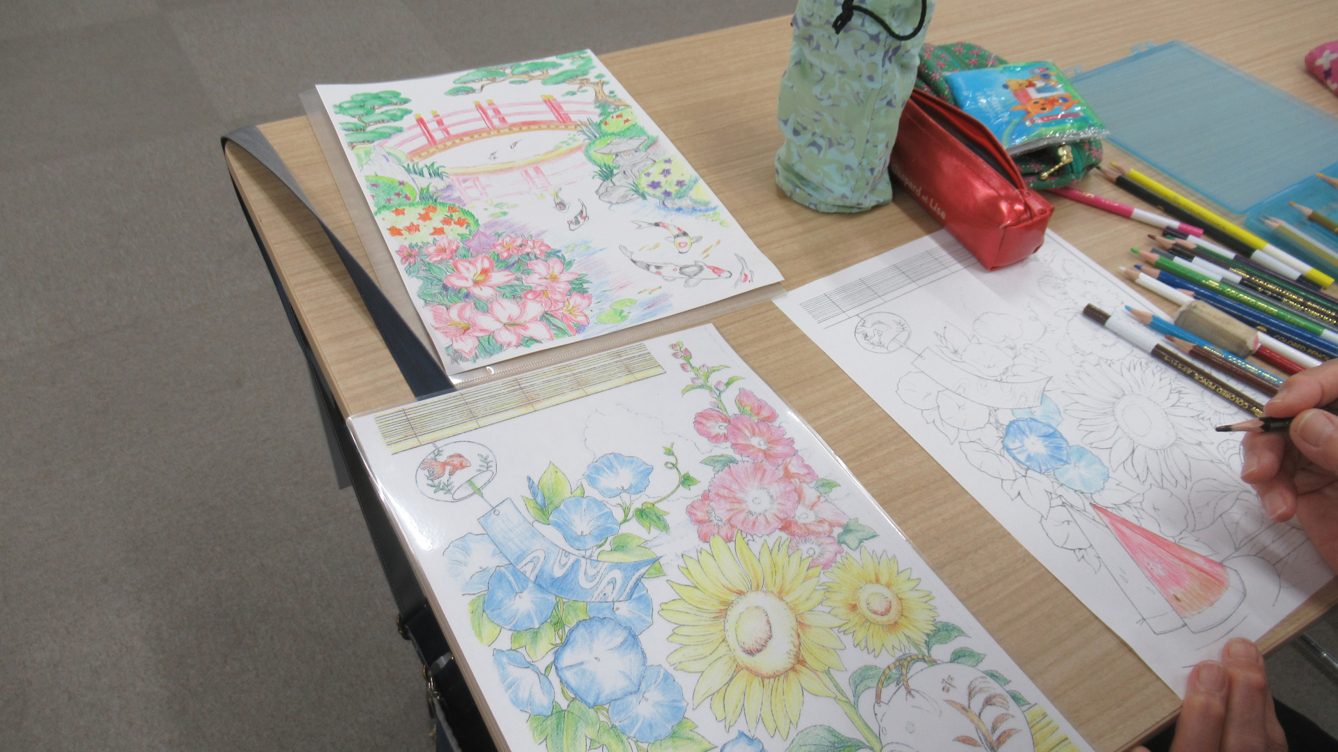 皆様、雨にもかかわらず集中してぬり絵を楽しまれています。季節を先取りして、夏らしい素材のぬり絵も楽しまれていました!