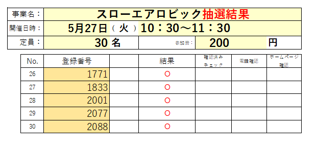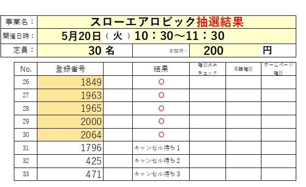 センター事務所前の掲示板にも、抽選結果が掲示してありますので、確認しましたら確認欄にチェックをお願いします。