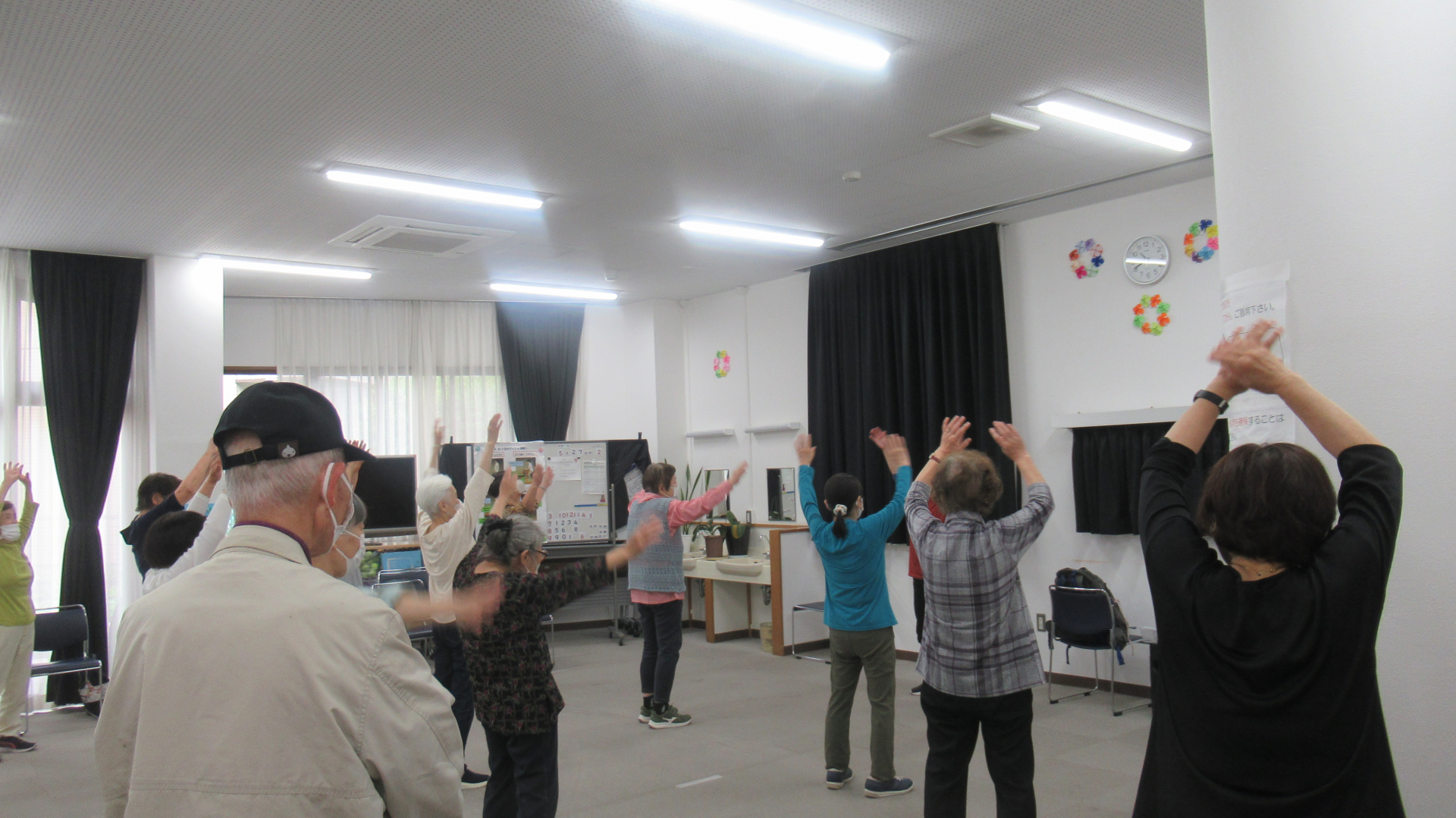懐かしい音楽に合わせて身体を動かしていきます。最後はストレッチもしっかりと行いました。