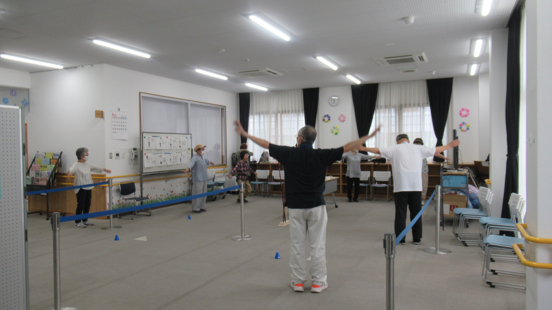 吹矢の道具説明・注意事項の確認をしてから、準備体操としてラジオ体操を行いました。