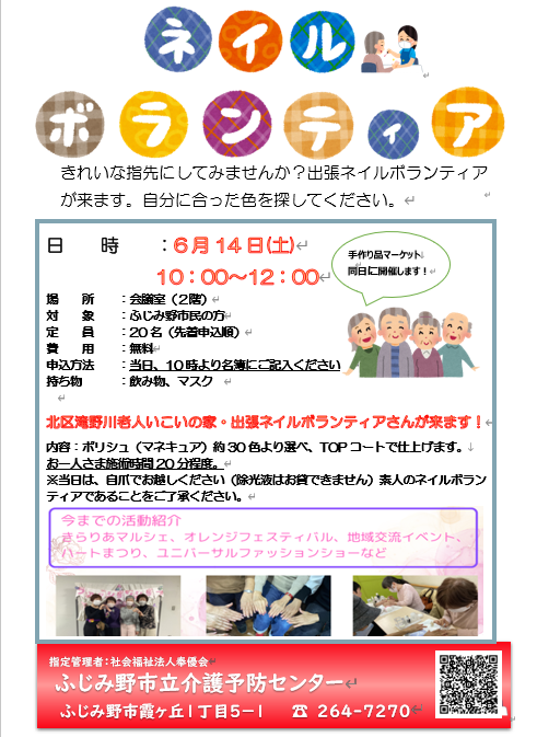 6月14日(土)に『手作り品マーケット』と『出張ネイルボランティア』が開催されます。