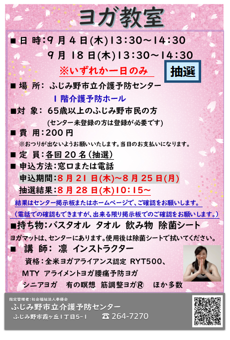9月開催『ヨガ教室』ですが、まだ空きがございます。