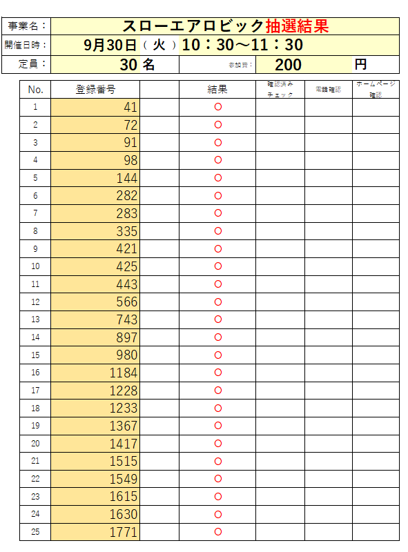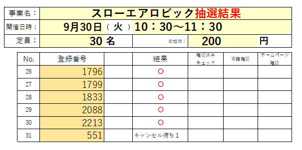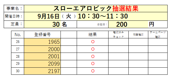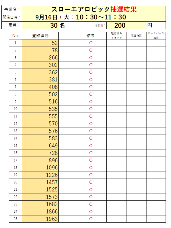 センター事務所前の掲示板にも、抽選結果が掲示してありますので、確認しましたら確認欄にチェックをお願いします。
