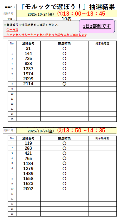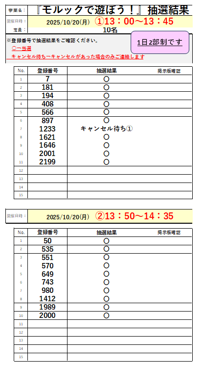 抽選結果は、館内にも掲示しております。ご確認後に、掲示版の確認欄にチェック印をご記入をお願いいたします。