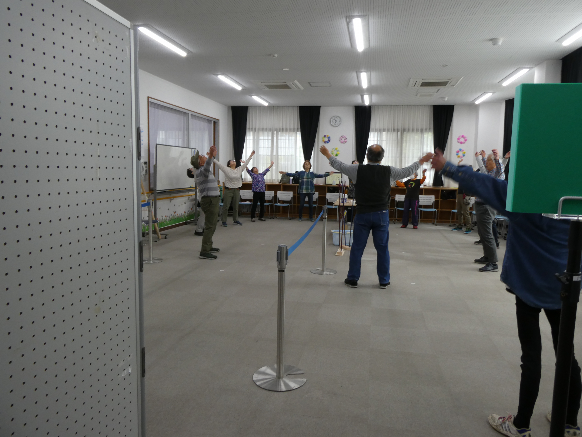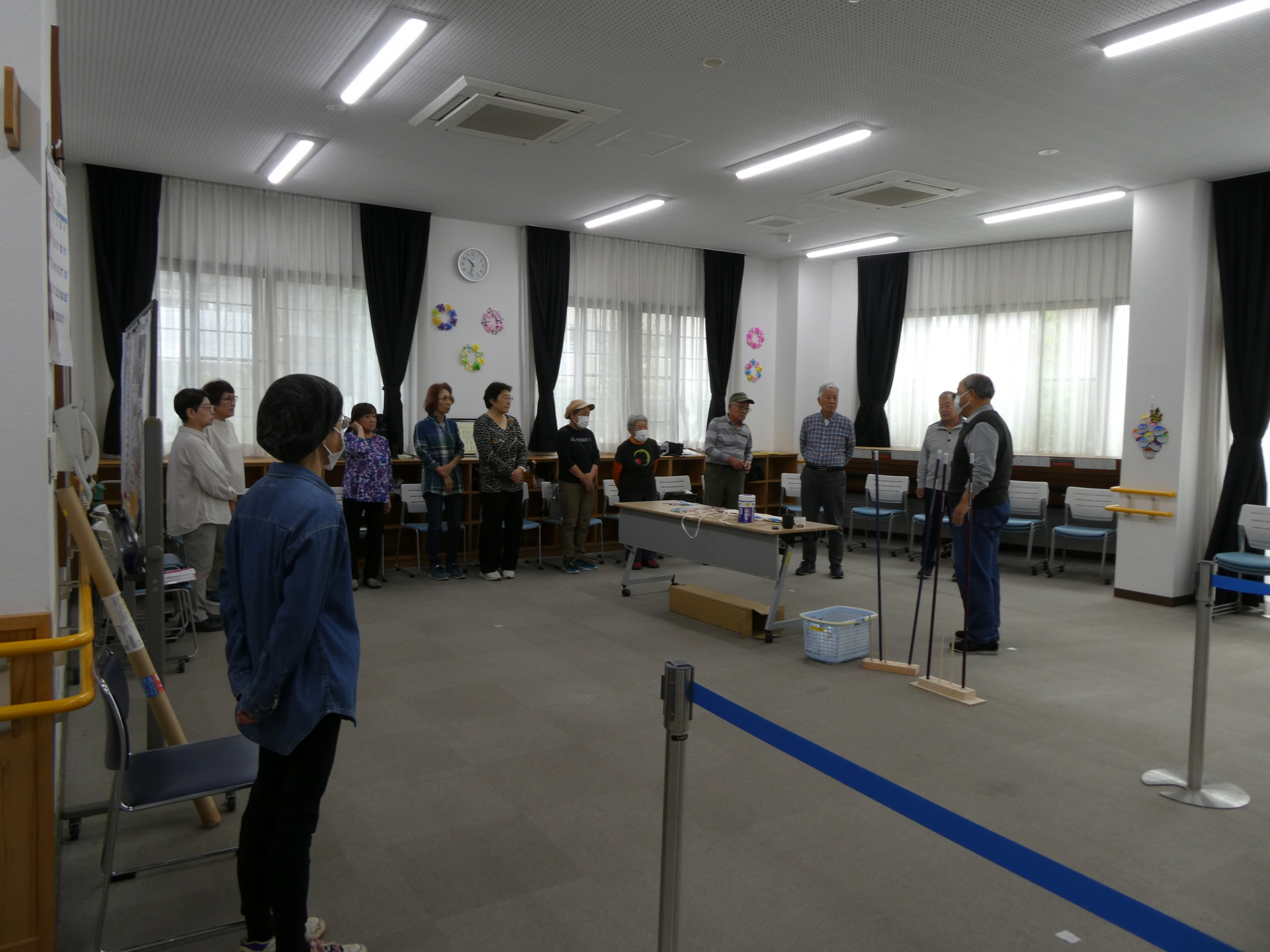吹矢の道具説明・注意事項の確認をしてから、準備体操としてラジオ体操を行いました。