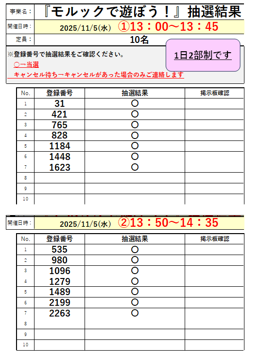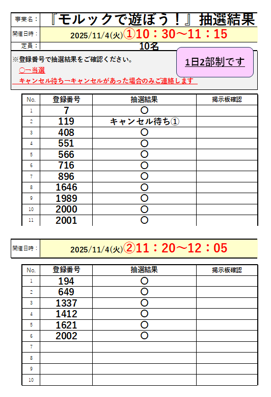 11月開催の『モルックで遊ぼう!』抽選結果発表をいたします。