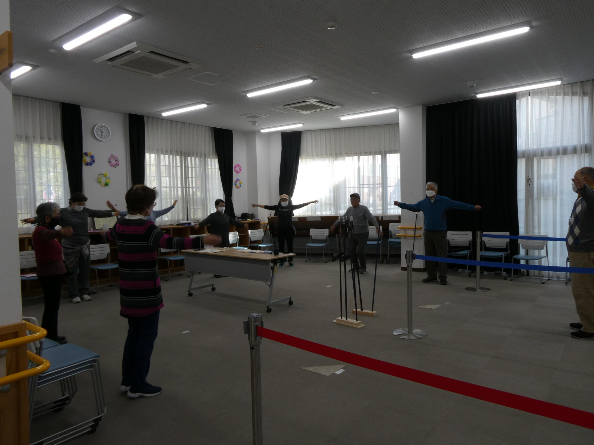 吹矢の道具説明・注意事項の確認をしてから、準備体操としてラジオ体操を行いました。