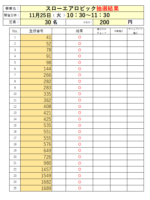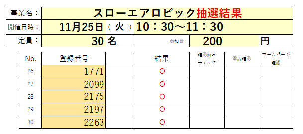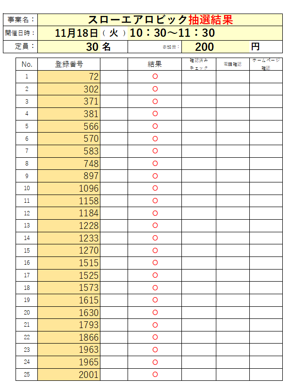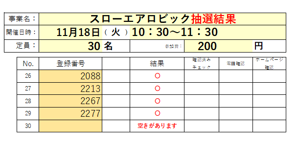 センター事務所前の掲示板にも、抽選結果が掲示してありますので、確認しましたら確認欄にチェックをお願いします。