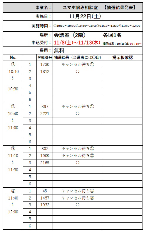 また、館内にも抽選結果を掲示しております。確認欄にチェック印を記入いただけると助かります。