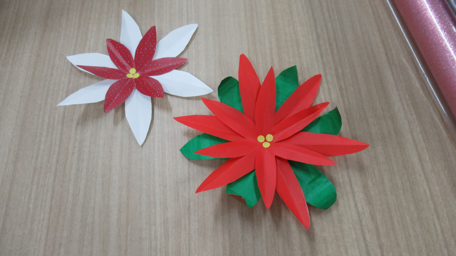続いて、ポインセチアのリース作りです。細かな折り作業が難しかったです。