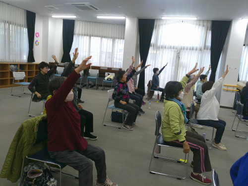 イスに座っての動作になりますが、足も動かし、全身の運動となります。