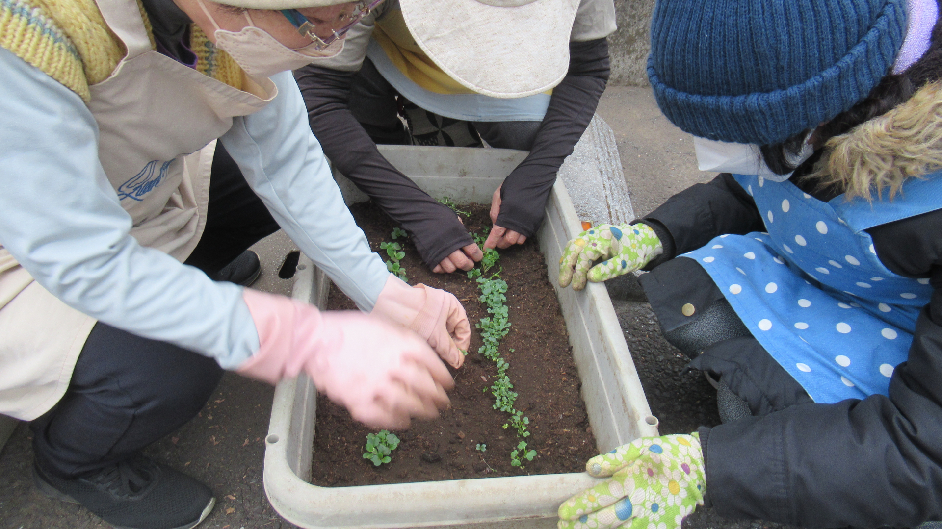 小松菜の可愛い芽を指2本分の間隔を空けて間引きしていきます。大きく育てるための大切な作業!皆さんで温かく見守っていきましょう。