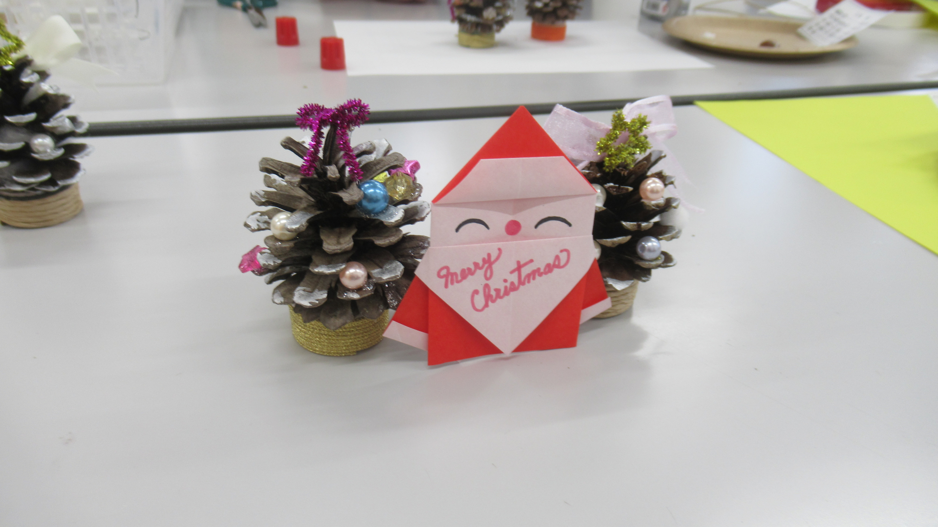 ふじみ野市立介護予防センターでは、ワクワク工作「松ぼっくりでクリスマスツリー」を作りました。