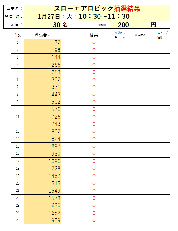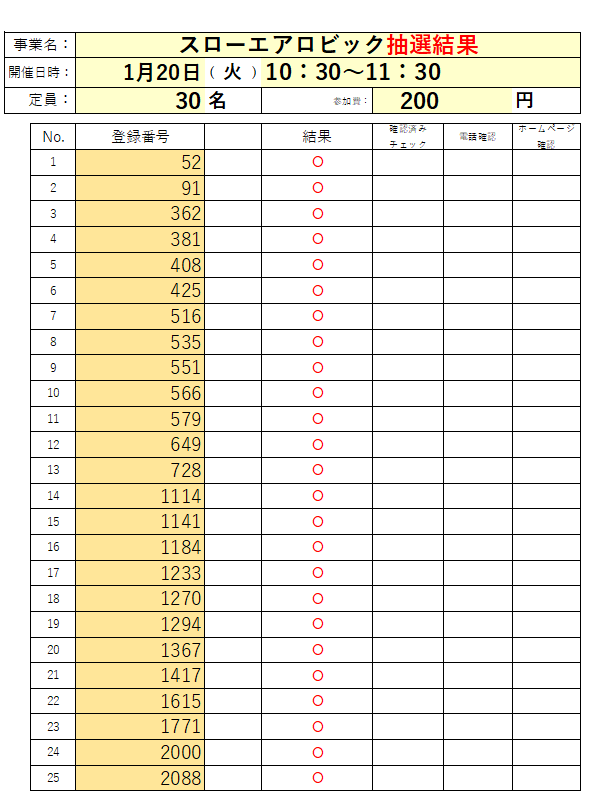 1月「スローエアロビック」の抽選結果です。