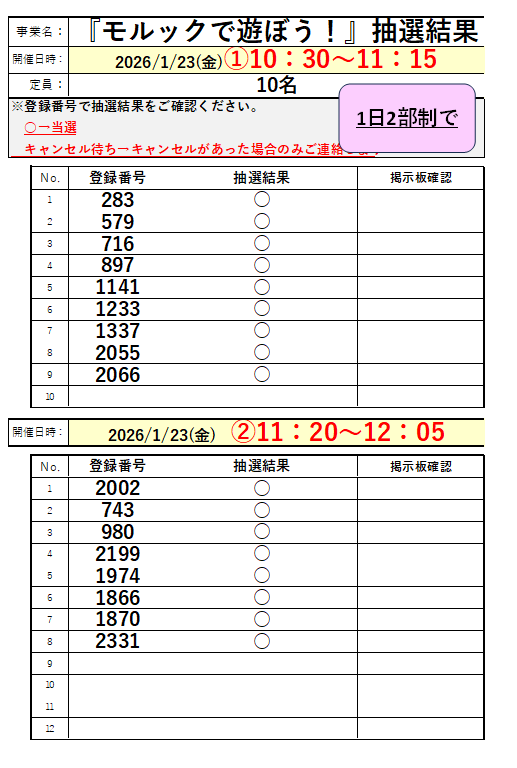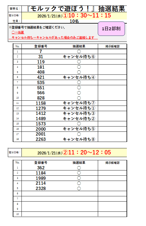 また、抽選結果は館内の掲示板にも貼り出します。確認欄にチェック印をご記入いただきますと助かります。